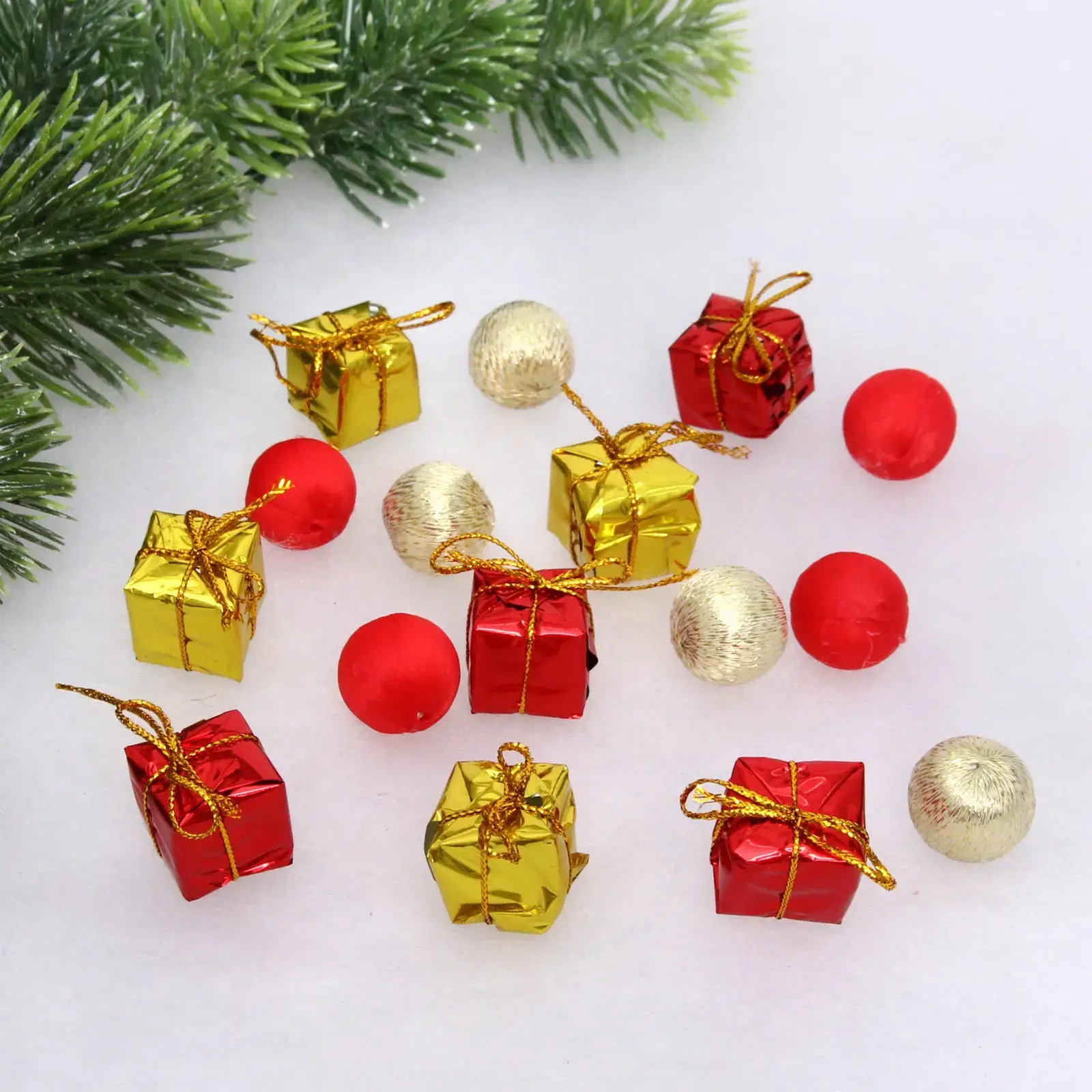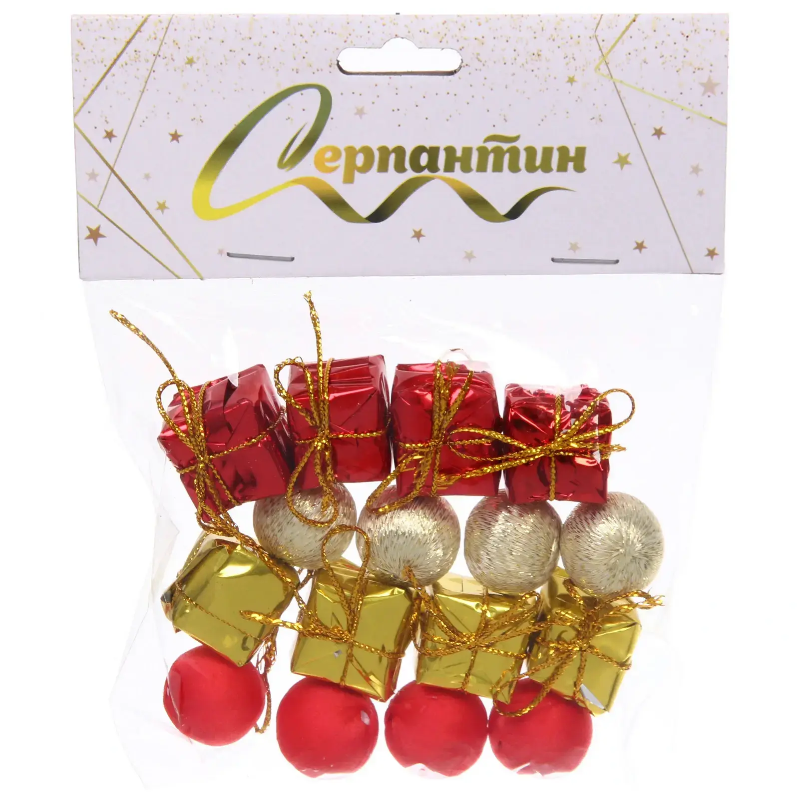 В набор входят шесть элементов: четыре маленькие подарочные коробки и два декоративных шара. Коробки выполнены в красном и золотом цветах, имеют квадратную форму и оформлены золотыми лентами. Шары представлены в красном и золотом цветах, округлой формы, что делает их идеальными для создания гармоничного новогоднего декора. Прозрачная упаковка позволяет видеть содержимое и добавляет привлекательности набору.