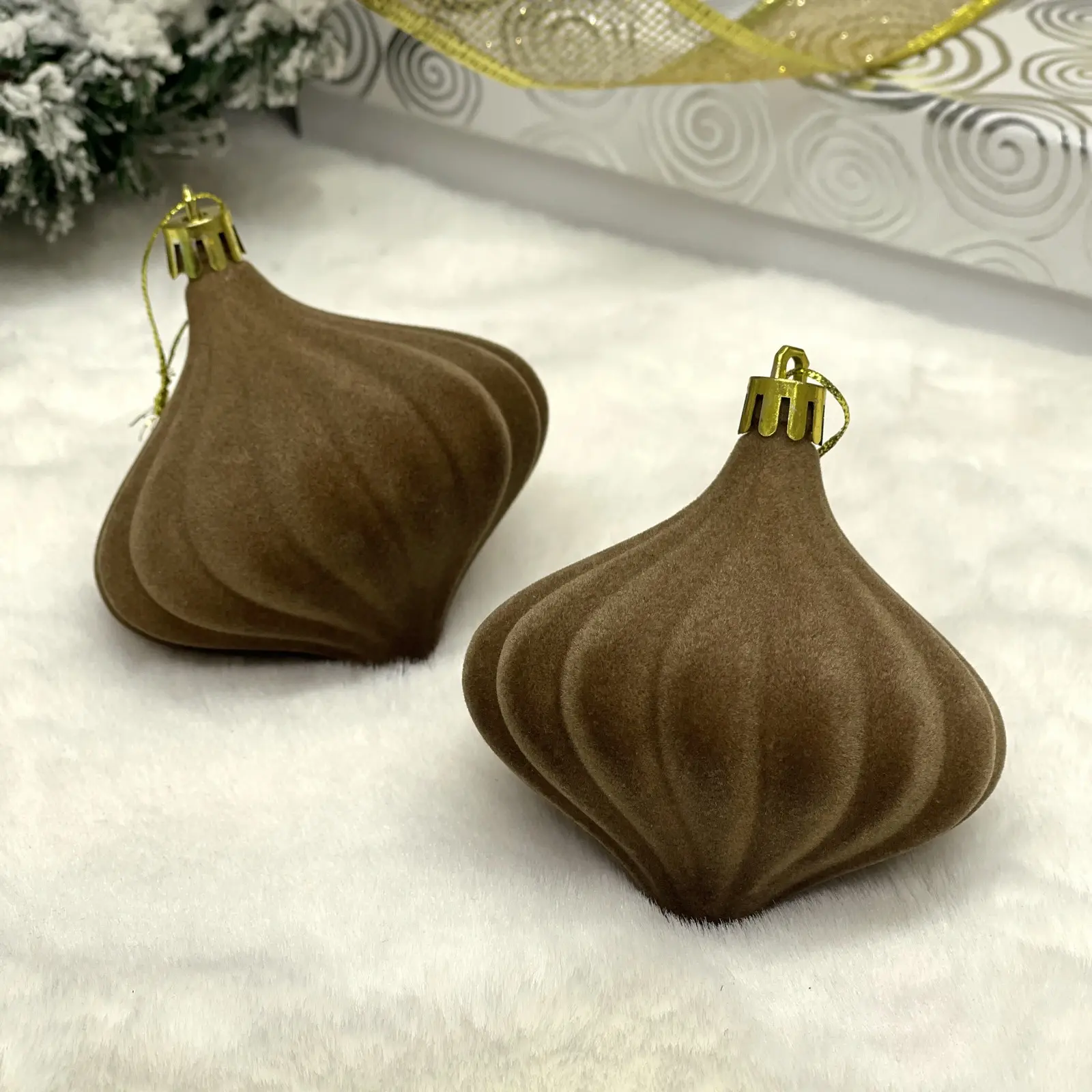 Превратите новогоднюю ёлку в настоящий шедевр с элегантными украшениями в благородном кофейном оттенке. Бархатистая текстура и золотистые элементы придадут вашему декору особый шик.