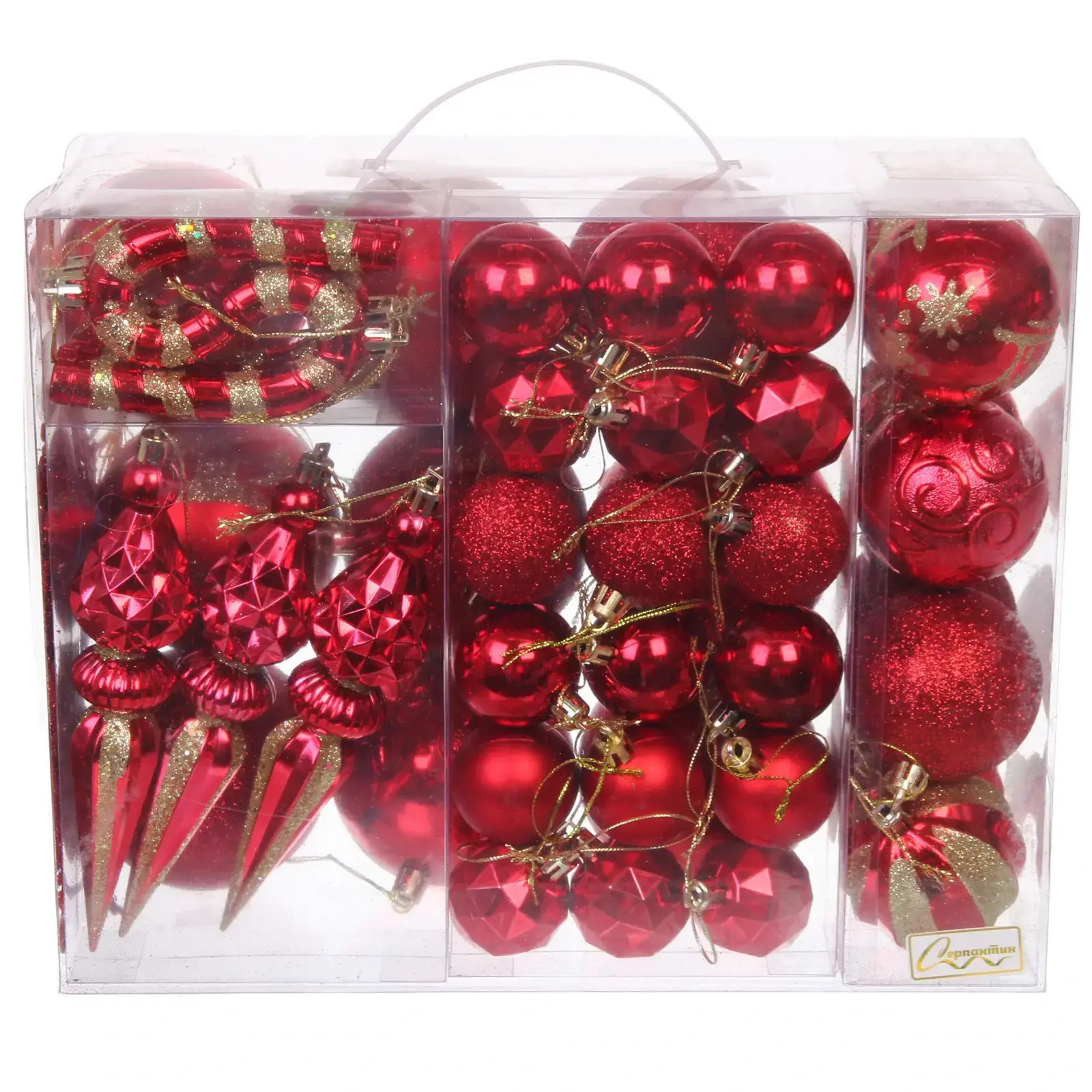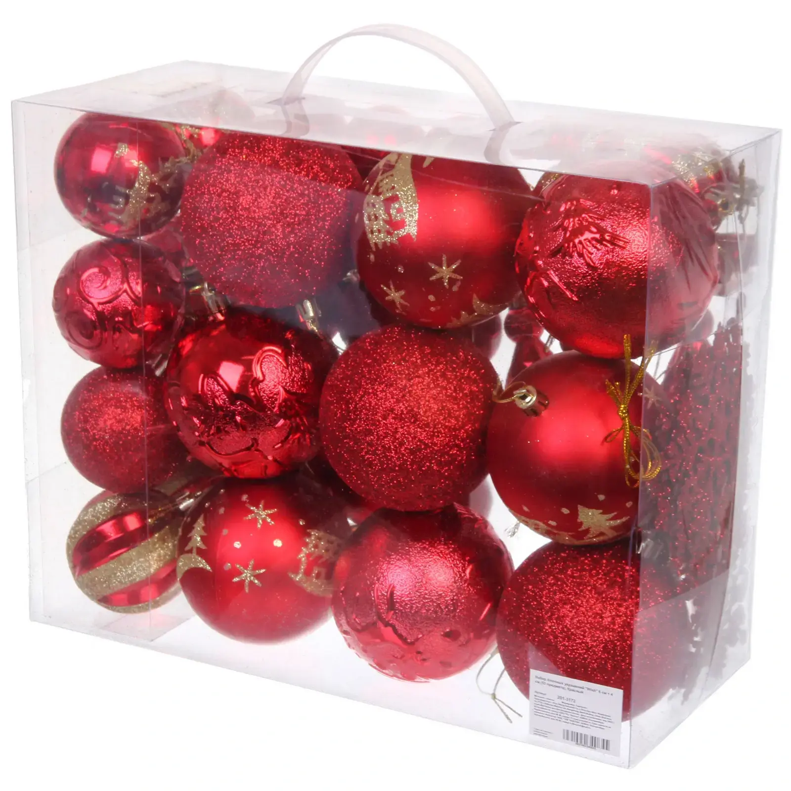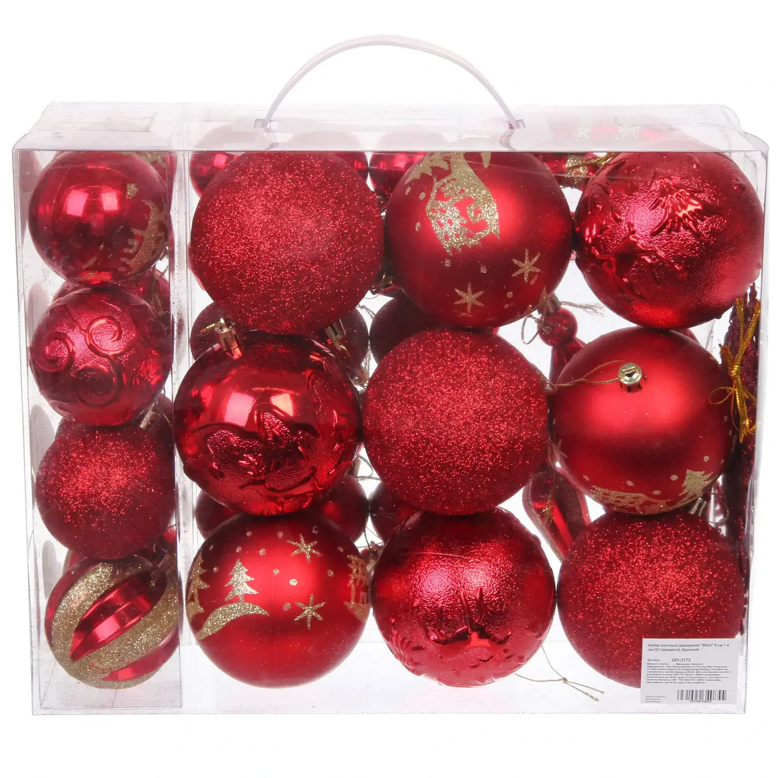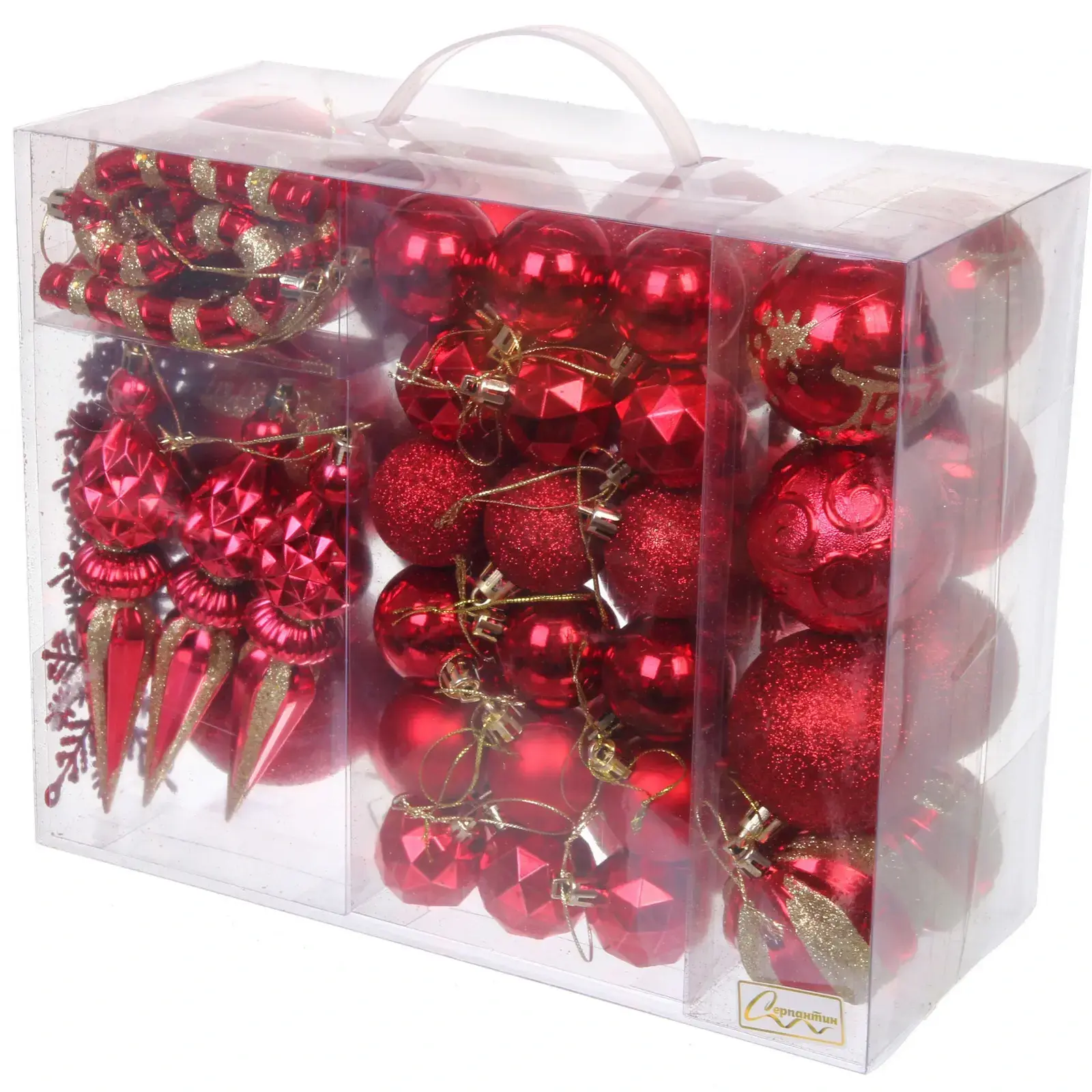 В набор входят 50 предметов, включая шары различных размеров (6 см и 4 см) и фигурные украшения. Все элементы выполнены в красном цвете с золотыми акцентами, что придаёт им особую привлекательность. Упаковка удобна для хранения и транспортировки, а прозрачный материал позволяет видеть содержимое, что упрощает выбор нужных украшений.