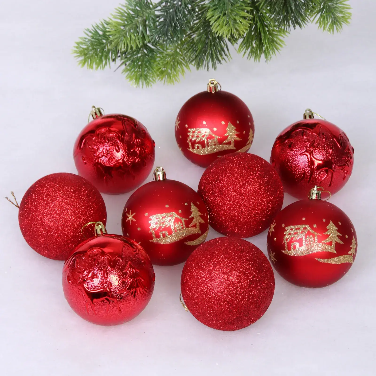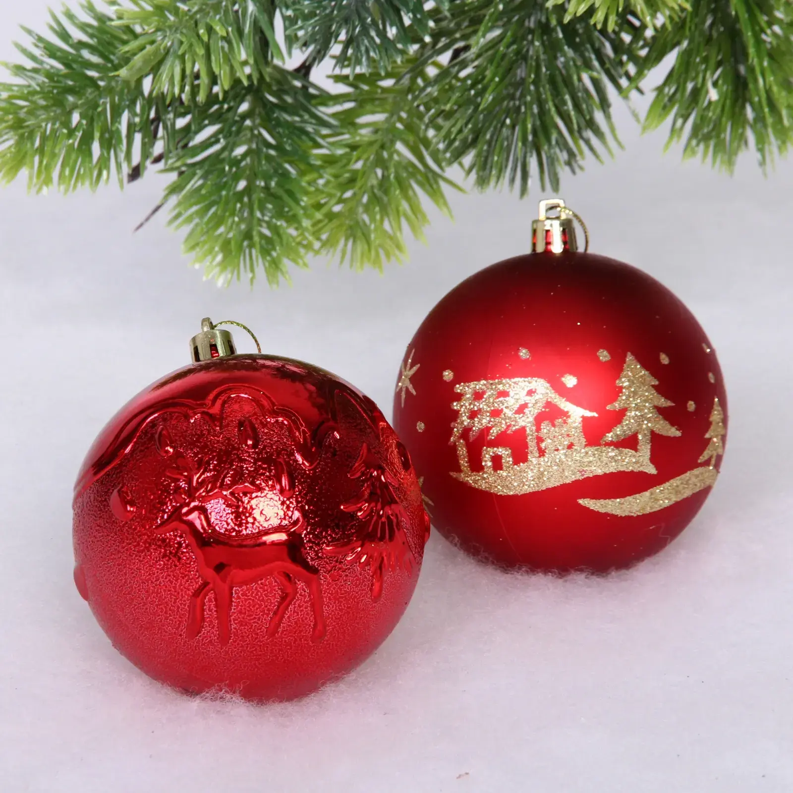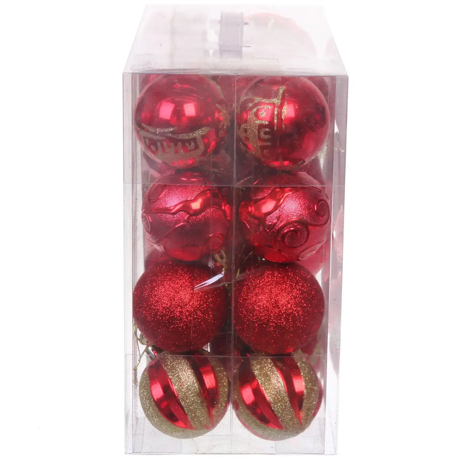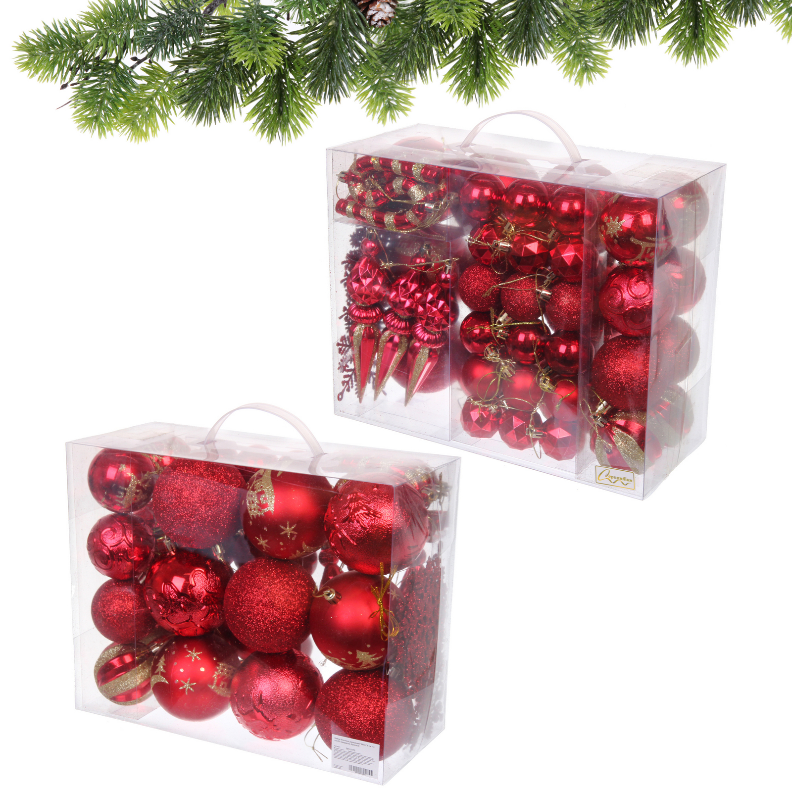 В набор входят 50 предметов, включая шары различных размеров (6 см и 4 см) и фигурные украшения. Все элементы выполнены в красном цвете с золотыми акцентами, что придаёт им особую привлекательность. Упаковка удобна для хранения и транспортировки, а прозрачный материал позволяет видеть содержимое, что упрощает выбор нужных украшений.