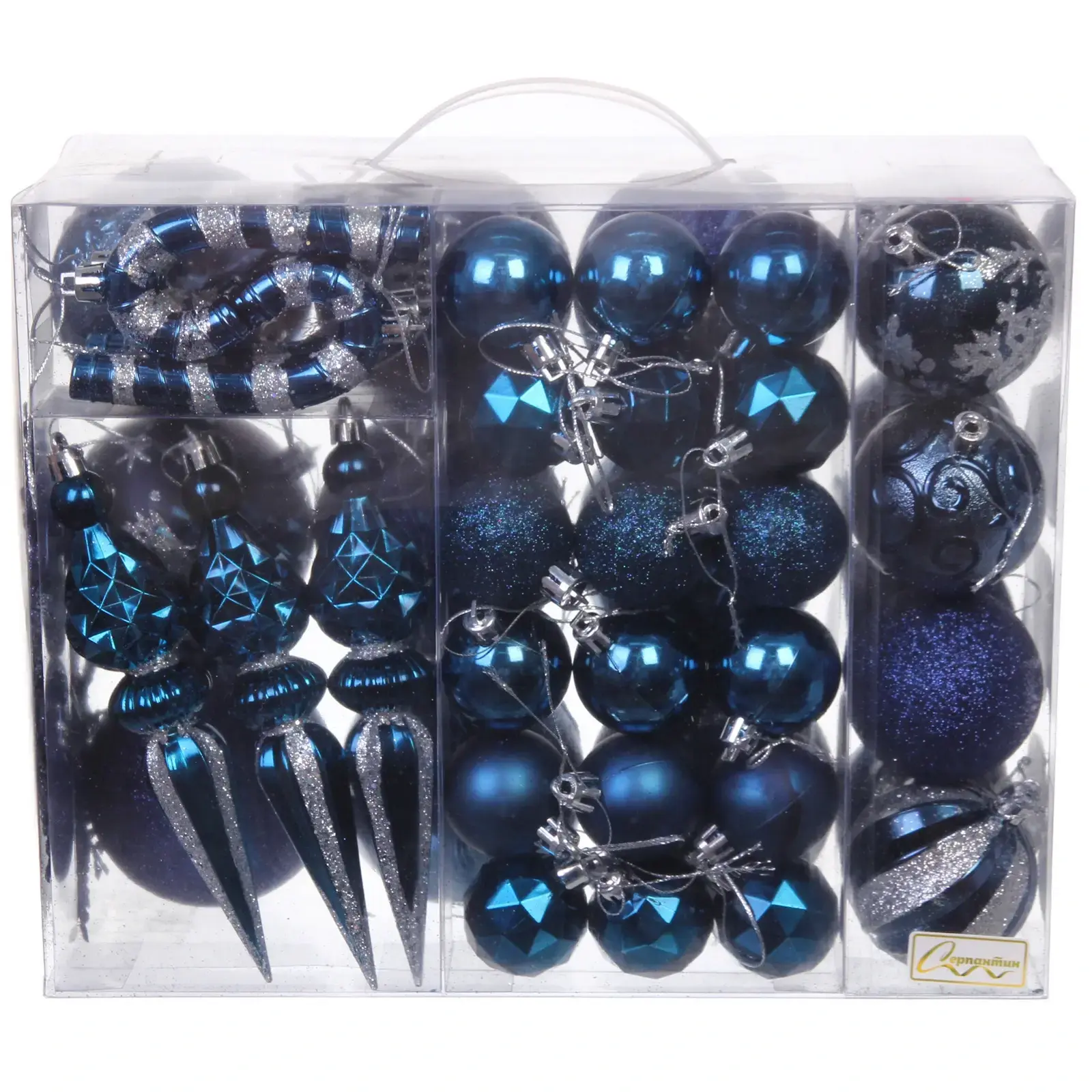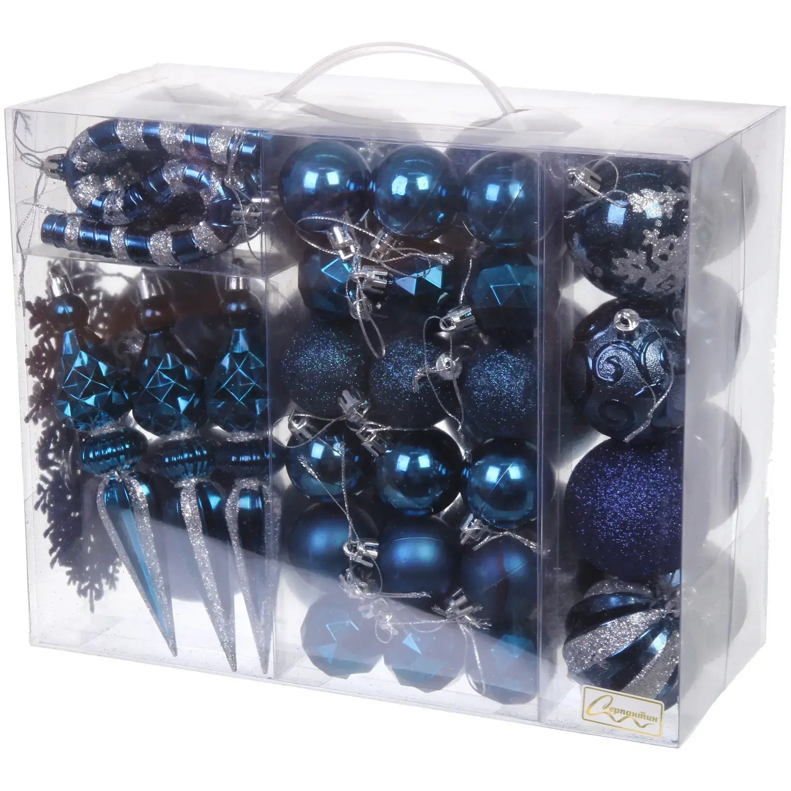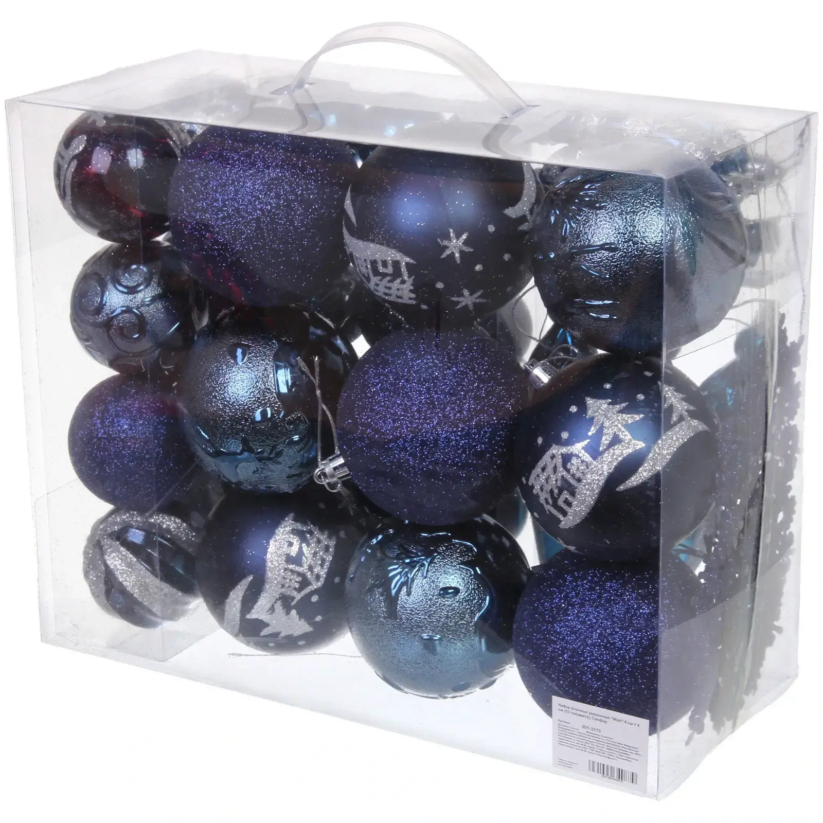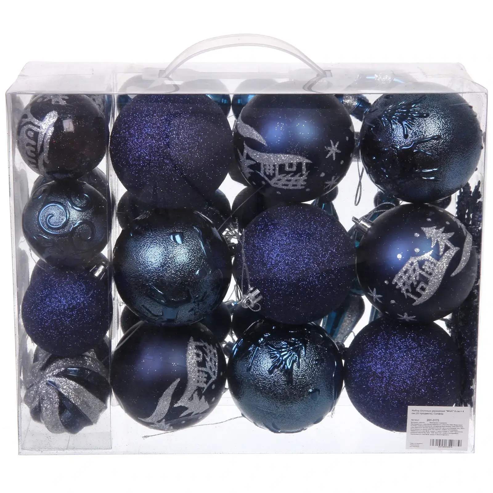 Каждое украшение в наборе имеет уникальный дизайн, включая матовые, глянцевые и блестящие поверхности. Цветовая гамма включает в себя различные оттенки синего, что делает набор универсальным для любого стиля оформления. Размеры шаров 6 см и 4 см идеально подходят для украшения ёлки, а также для создания праздничных композиций на столе или в интерьере.