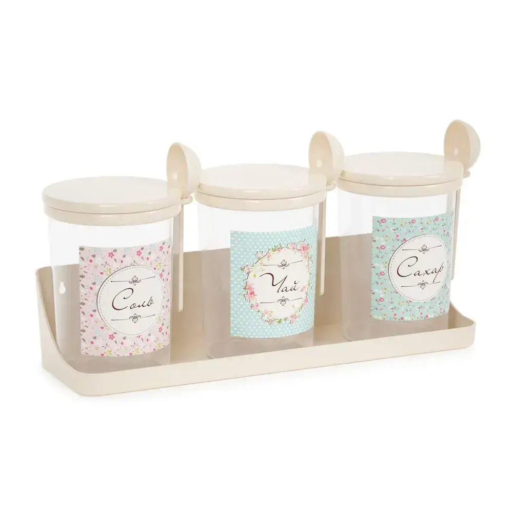 Набор контейнеров для сыпучих продуктов с подставкой, 9 предметов, 1л, пластик, бежевый