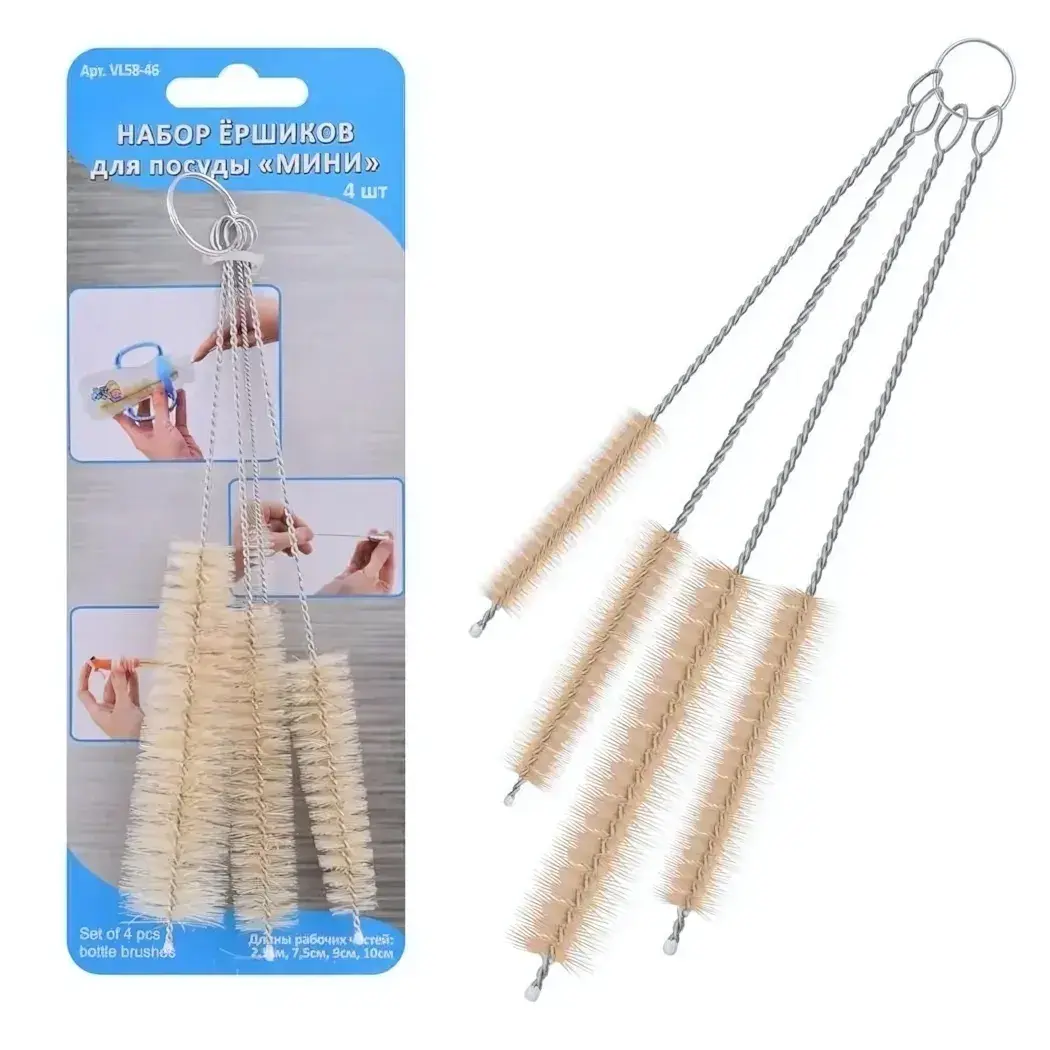 Набор из 4 профессиональных ёршиков создан для эффективного удаления загрязнений в самых труднодоступных местах. Миниатюрные размеры и продуманная конструкция делают их незаменимыми для ухода за бутылками, узкими горлышками и мелкой кухонной утварью.