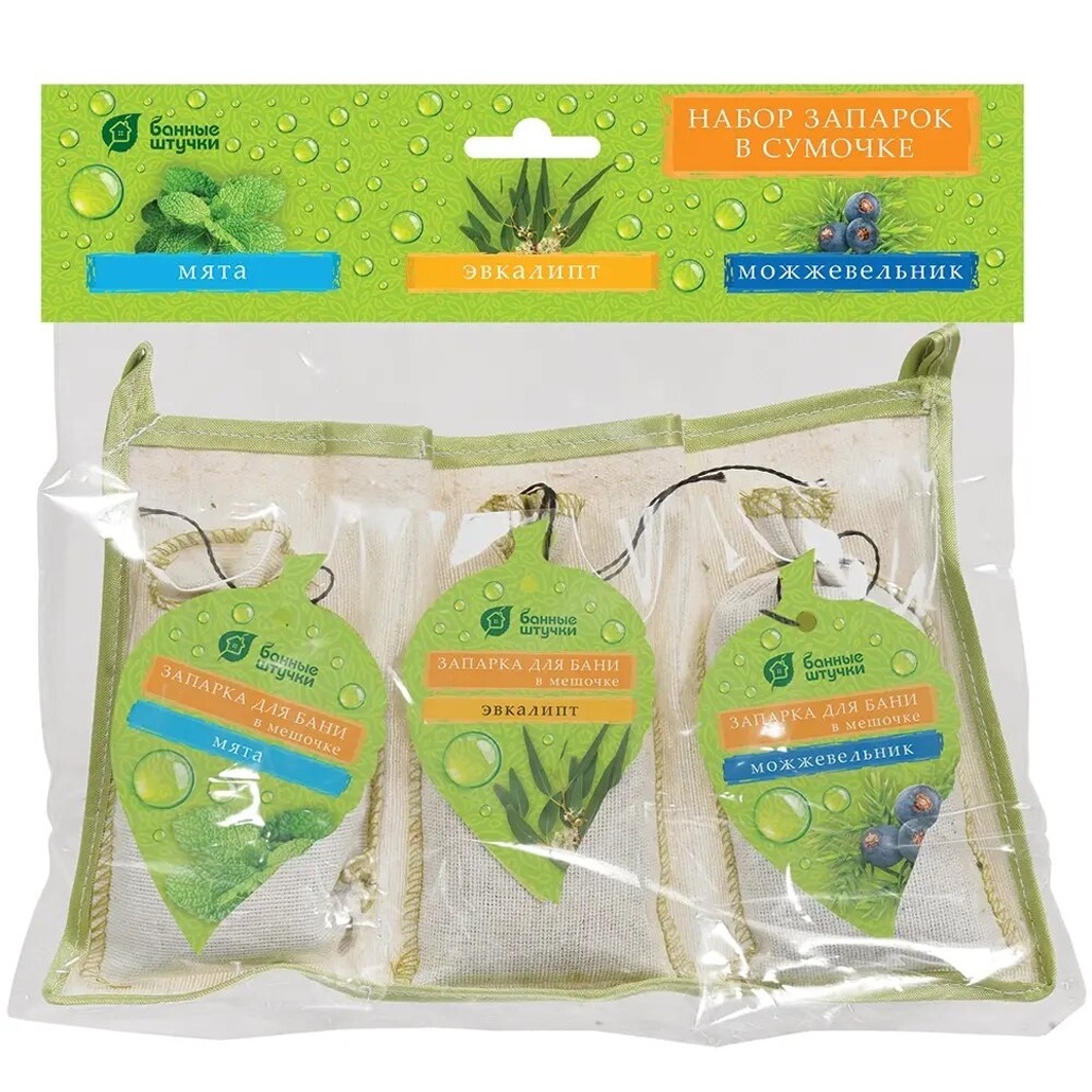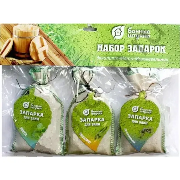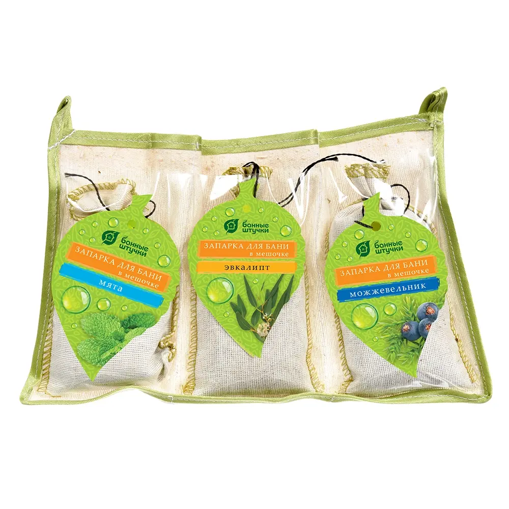 Идеально подходит для домашнего использования и подарка любителям банных процедур. Каждый мешочек содержит натуральные травы: мята, эвкалипт и можжевельник, что обеспечивает насыщенный аромат и полезные свойства во время парения.