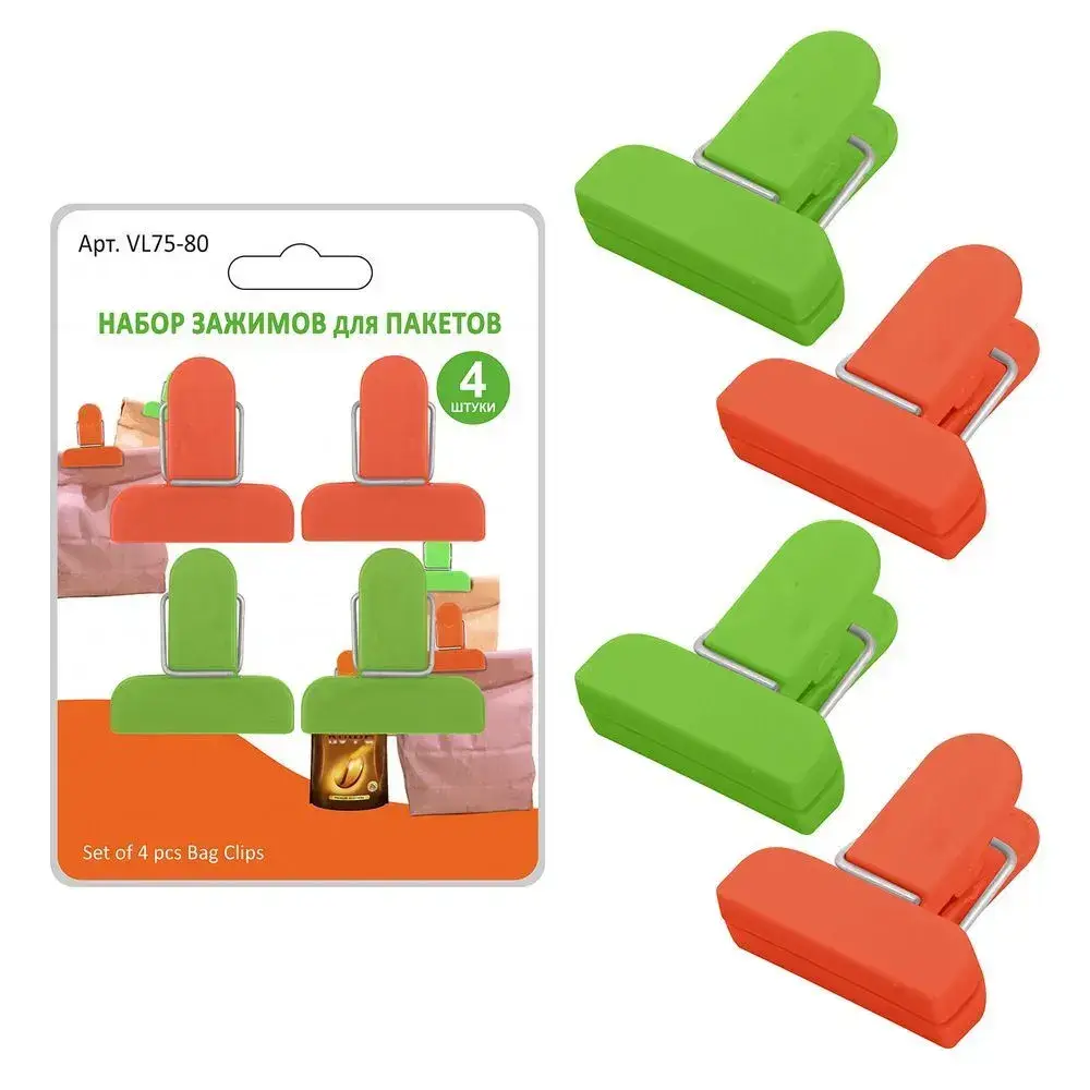 Зажимы для пакетов, набор 4 шт, металл/пластик, цвета зеленый/оранжевый