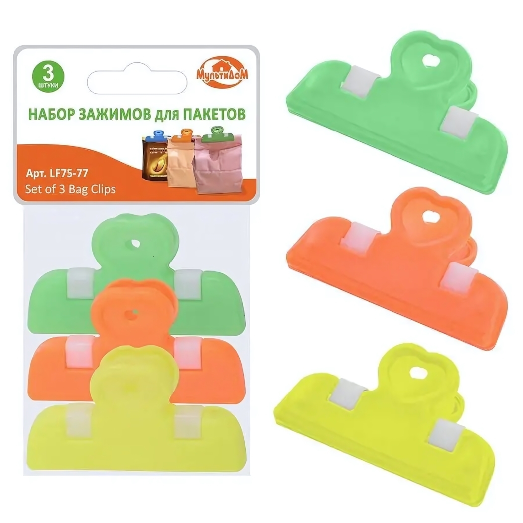 Набор зажимов для пакетов, 3 шт, 6,5 см, пластик, 4 цвета микс