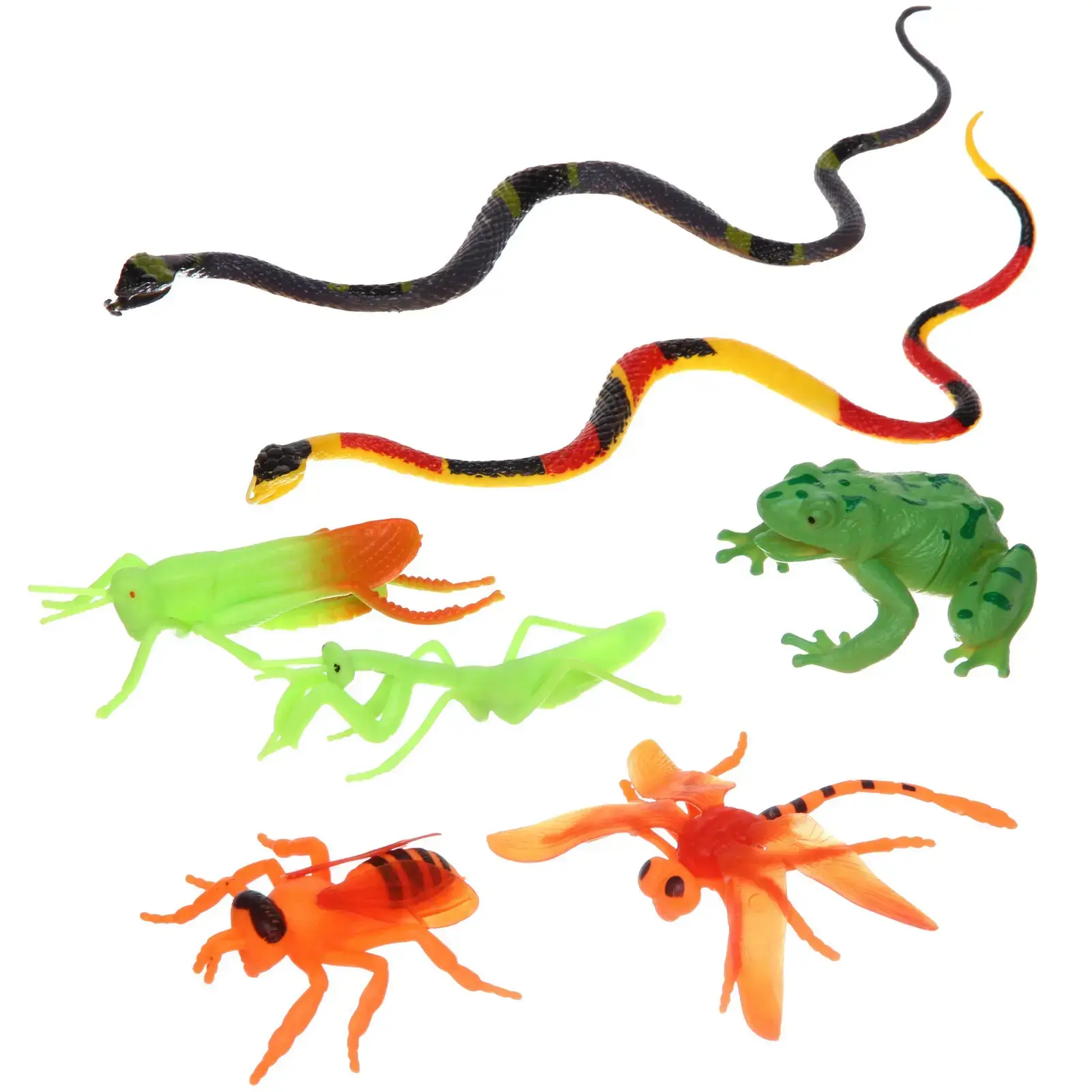 Размеры фигурок составляют 24х23х4.5 см, что делает их удобными для маленьких ручек. В набор входят различные животные и насекомые, такие как змеи, лягушки и насекомые, выполненные в ярких цветах: зеленом, красном, оранжевом и черном. Эти игрушки не только развлекают, но и обучают, что делает их идеальным выбором для родителей, стремящихся к гармоничному развитию своих детей.
