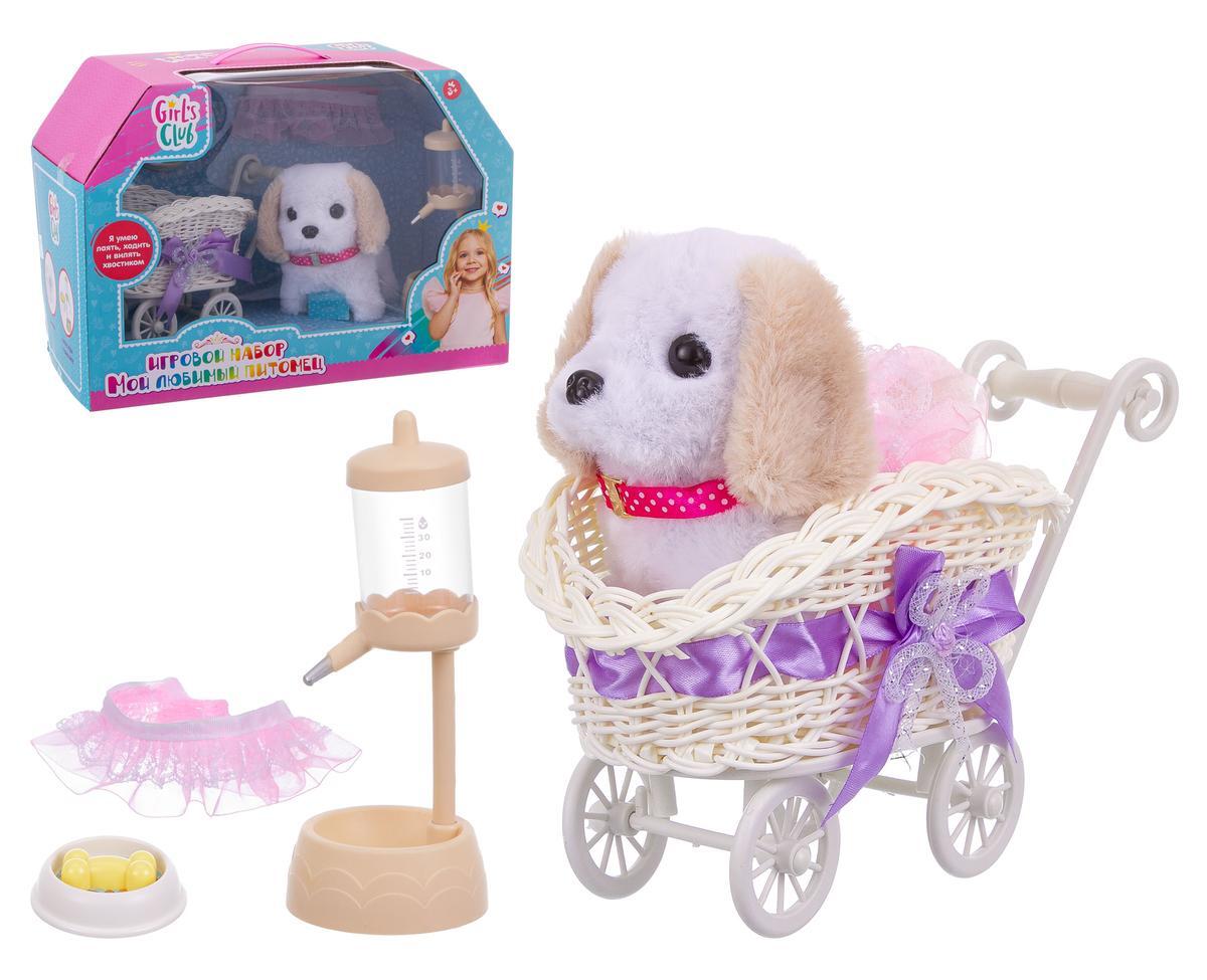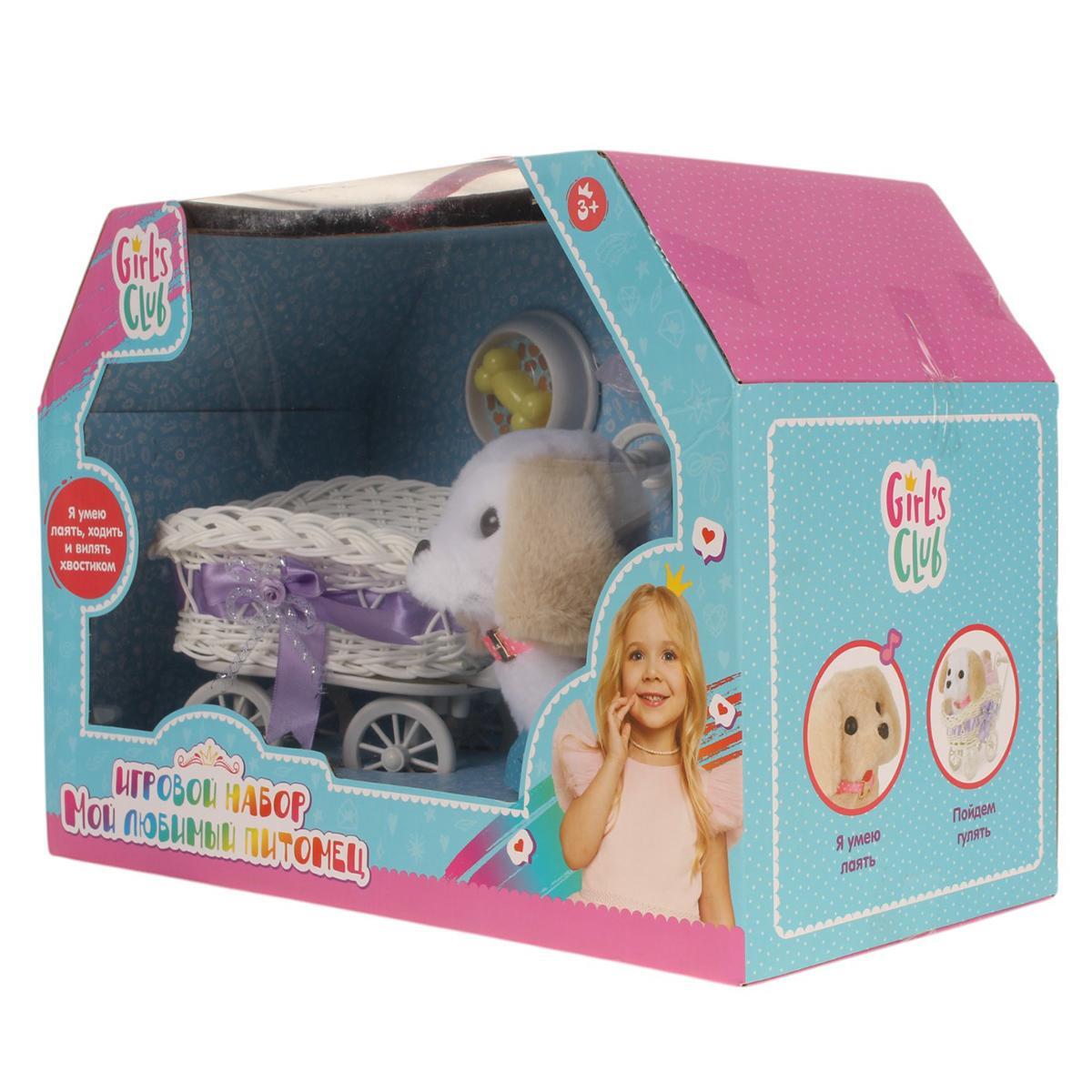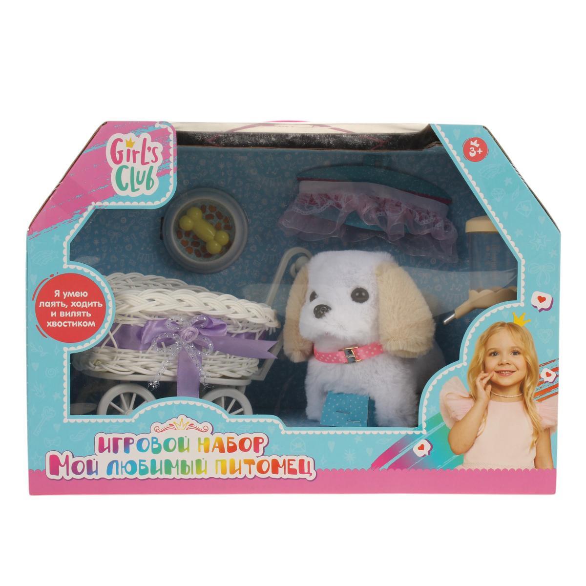 В набор входят: щенок белого цвета с коричневыми ушами, коляска с розовой лентой, поилка и миска. Все элементы набора выполнены из качественных и безопасных материалов. Размеры и другие количественные характеристики не указаны, но все детали идеально подходят для детских рук. Набор упакован в яркую коробку с изображением девочки и надписью 'Girls Club', что делает его отличным вариантом для подарка.