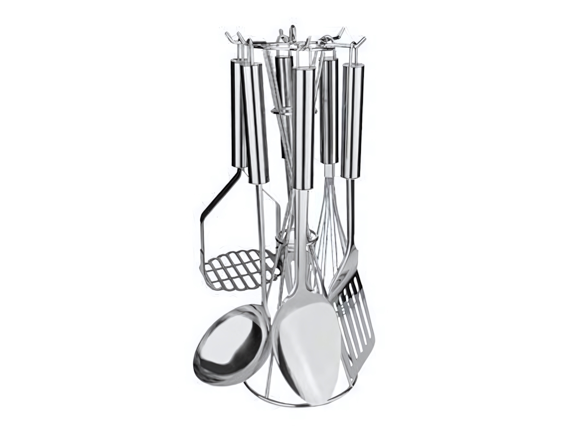 Этот функциональный набор кухонных принадлежностей из 7 предметов станет надежным помощником на вашей кухне. Он сочетает практичность, долговечность и эстетику, благодаря полностью металлическому исполнению с глянцевой поверхностью. Комплект включает половник, шумовку, лопатку с отверстиями, венчик, ложку и толкушку для картофеля, аккуратно размещенные на круглой подставке с крючками для подвешивания.