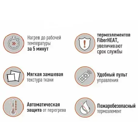 Инновационная компоновка карбоновых волокон предотвращает перегибы и локальный перегрев. Встроенная система защиты автоматически отключает питание при достижении критической температуры или неисправностях. Пожаробезопасный термоэлемент соответствует международным стандартам качества.