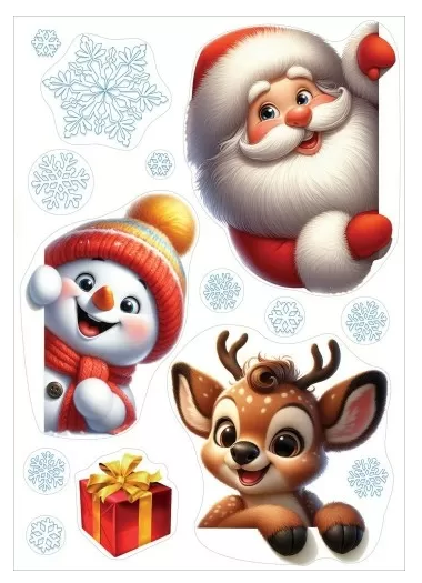 Создайте теплую новогоднюю атмосферу за считанные минуты! Яркая двусторонняя наклейка с сюжетом «Дед Мороз и его помощники» оживит любое помещение, будь то дом, офис или витрина магазина. Плотный глянцевый УФ-лак придает изображению насыщенность и блеск, а персонажи — Санта-Клаус, снеговик, олень и праздничный подарок — создают ощущение радости и уюта.