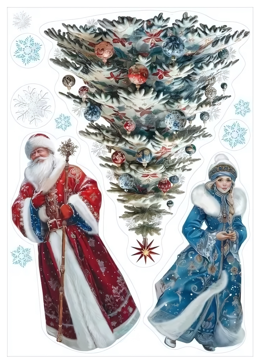 Подарите вашему интерьеру атмосферу праздника с яркой двусторонней наклейкой формата А3, изображающей Деда Мороза, Снегурочку и нарядную ель. Сочетание насыщенных цветов и праздничной иллюстрации создаёт уют и новогоднее настроение с первых секунд.