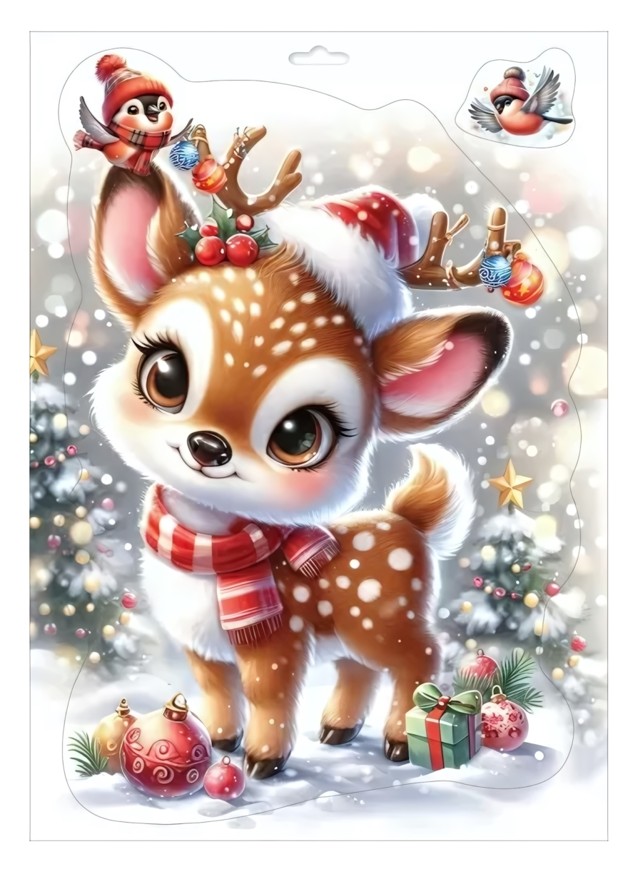 Двусторонняя наклейка А4 с оленёнком в зимнем оформлении