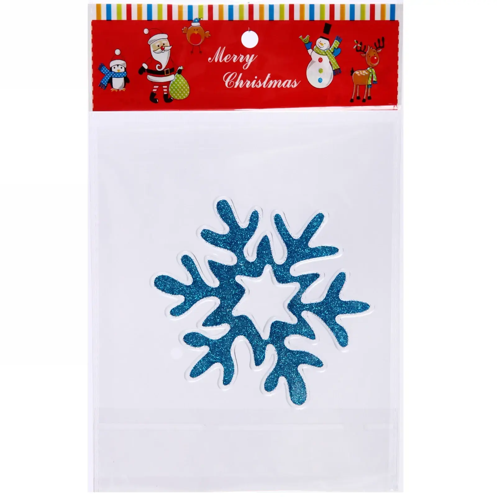 Размер наклейки составляет 14х17 см, что делает её универсальной для различных применений. Силиконовый материал обеспечивает легкость в уходе и долговечность, а блестящая поверхность добавляет праздничного настроения. Наклейка упакована в прозрачную упаковку с красным верхом, украшенную изображениями зимних персонажей, что делает её отличным подарком для друзей и близких.