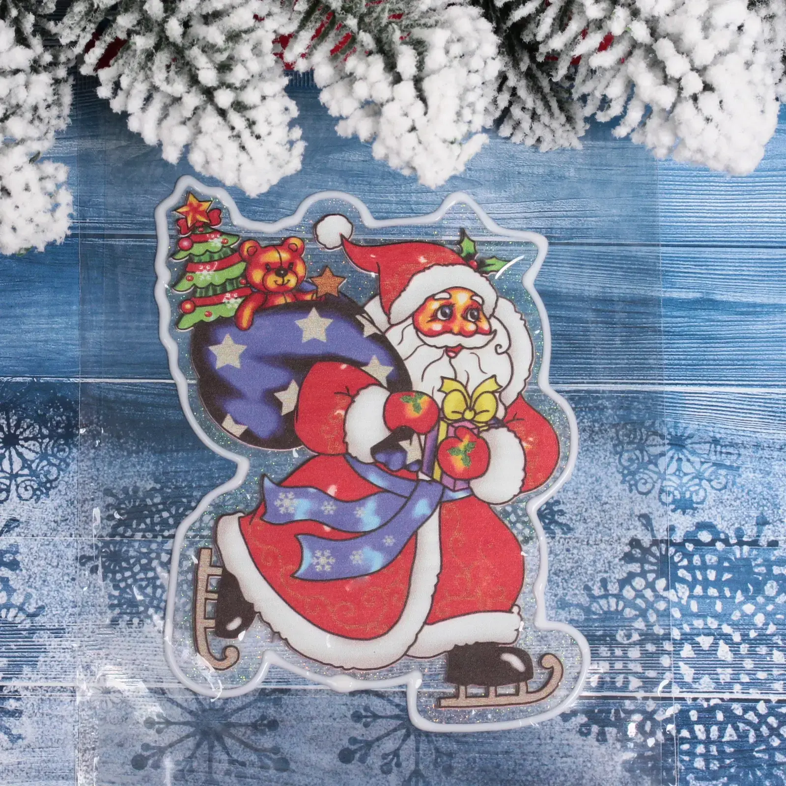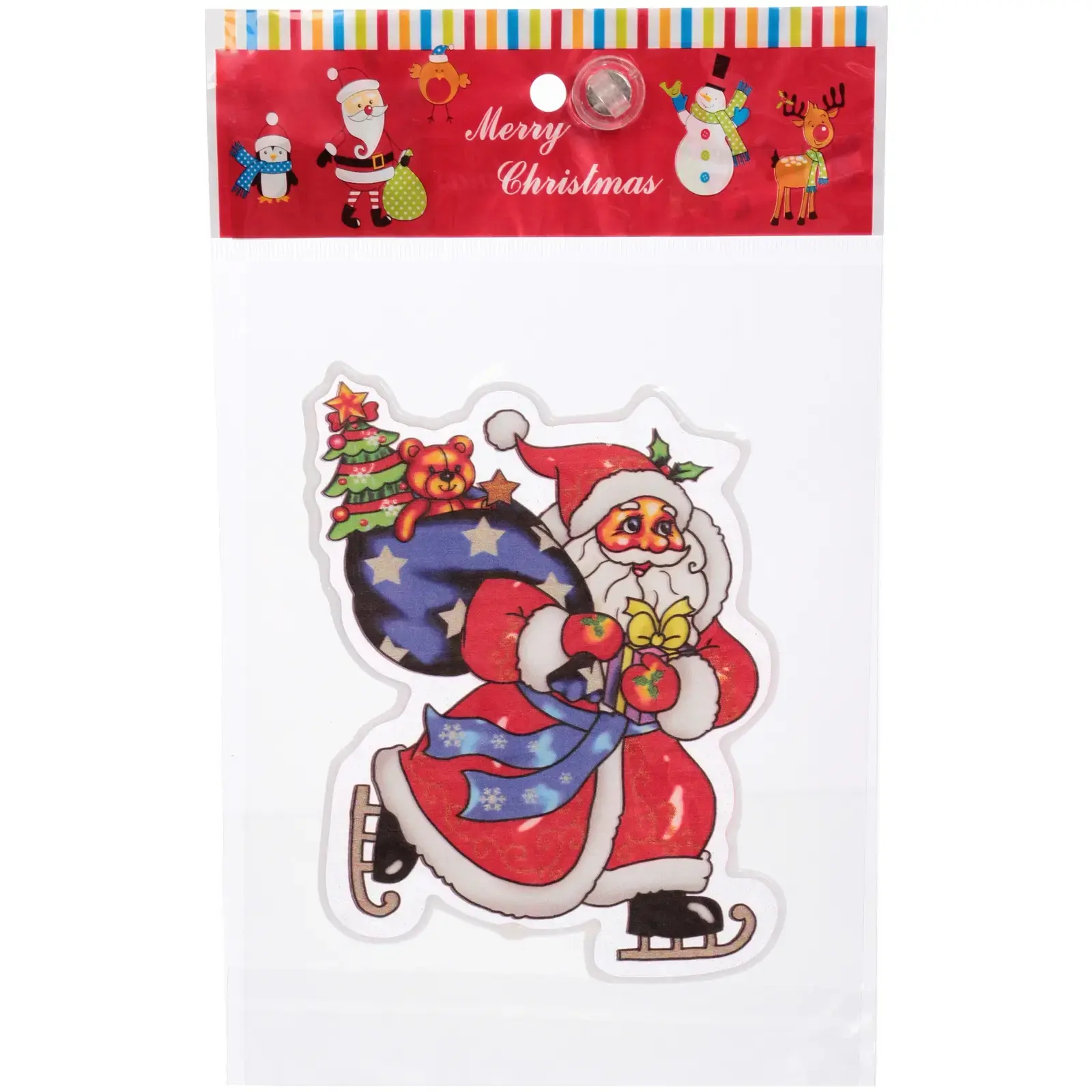 Размер наклейки составляет 15х20 см, что делает ее заметной, но не слишком громоздкой. Она выполнена в ярких цветах: красном, зеленом, желтом и синем, что делает ее универсальной для любого новогоднего декора. Наклейка изображает Деда Мороза с мешком, полным подарков, что добавляет праздничного настроения и радости.