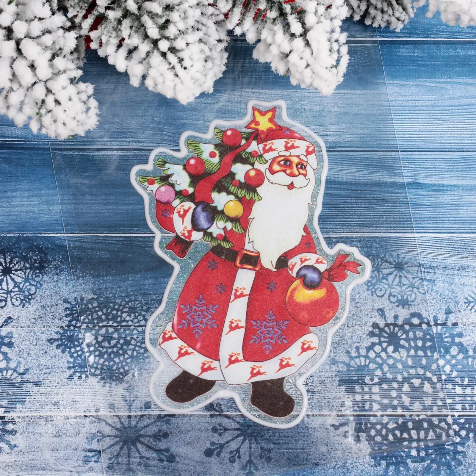 Эта наклейка на стекло станет ярким акцентом в вашем праздничном декоре. Она выполнена из качественного ПВХ, что обеспечивает долговечность и яркость цветов. Наклейка изображает добродушного Дедушку Мороза с рождественской ёлкой, украшенной разноцветными шарами, что добавляет атмосферу праздника в ваш дом.