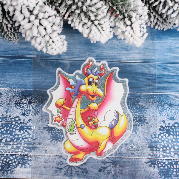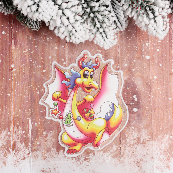 Создайте атмосферу праздника с помощью нашей наклейки на стекло «Дракон с гирляндами». Этот яркий и красочный декор станет отличным дополнением к вашему новогоднему оформлению. Дракон, выполненный в желтых, красных и синих тонах, с радостным выражением лица и гирляндами, привнесет в ваш дом радость и веселье.