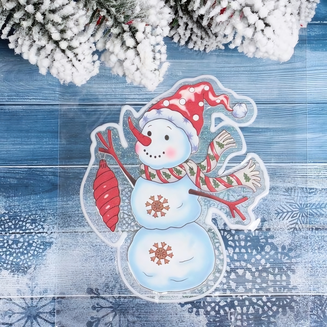 Создайте атмосферу зимней сказки у себя дома с помощью яркой новогодней наклейки на стекло. Весёлый снеговик в красной шапке, с милым шарфом и праздничной игрушкой в руке добавит уюта и радости, а также станет эффектным элементом праздничного оформления.