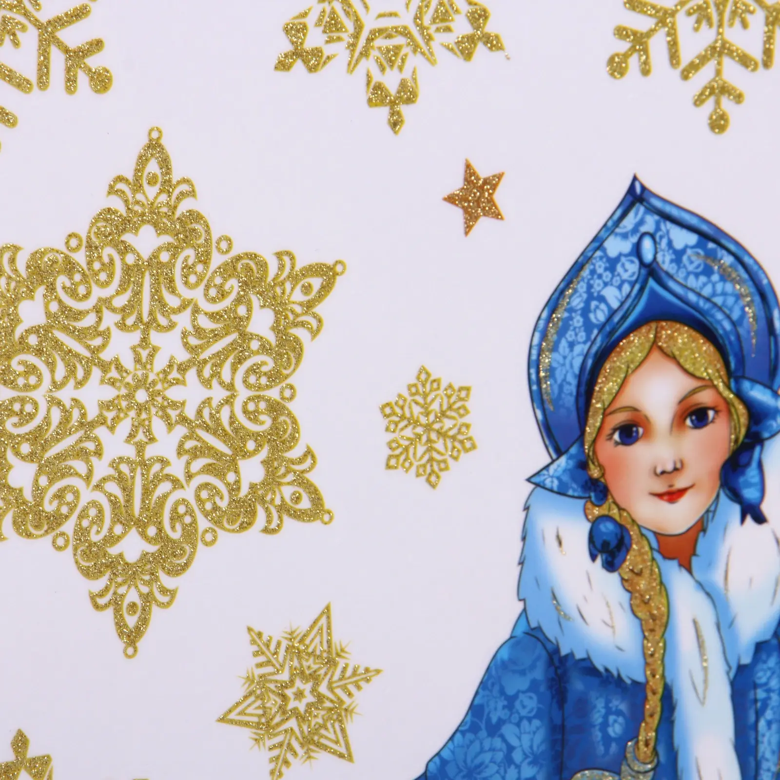 Композиция объединяет главные символы зимы: золотые колокольчики, пушистых зверят в окружении еловых ветвей и таинственного северного сияния. Многослойная печать передаёт объём декоративных элементов — снежинки мерцают при изменении освещения.