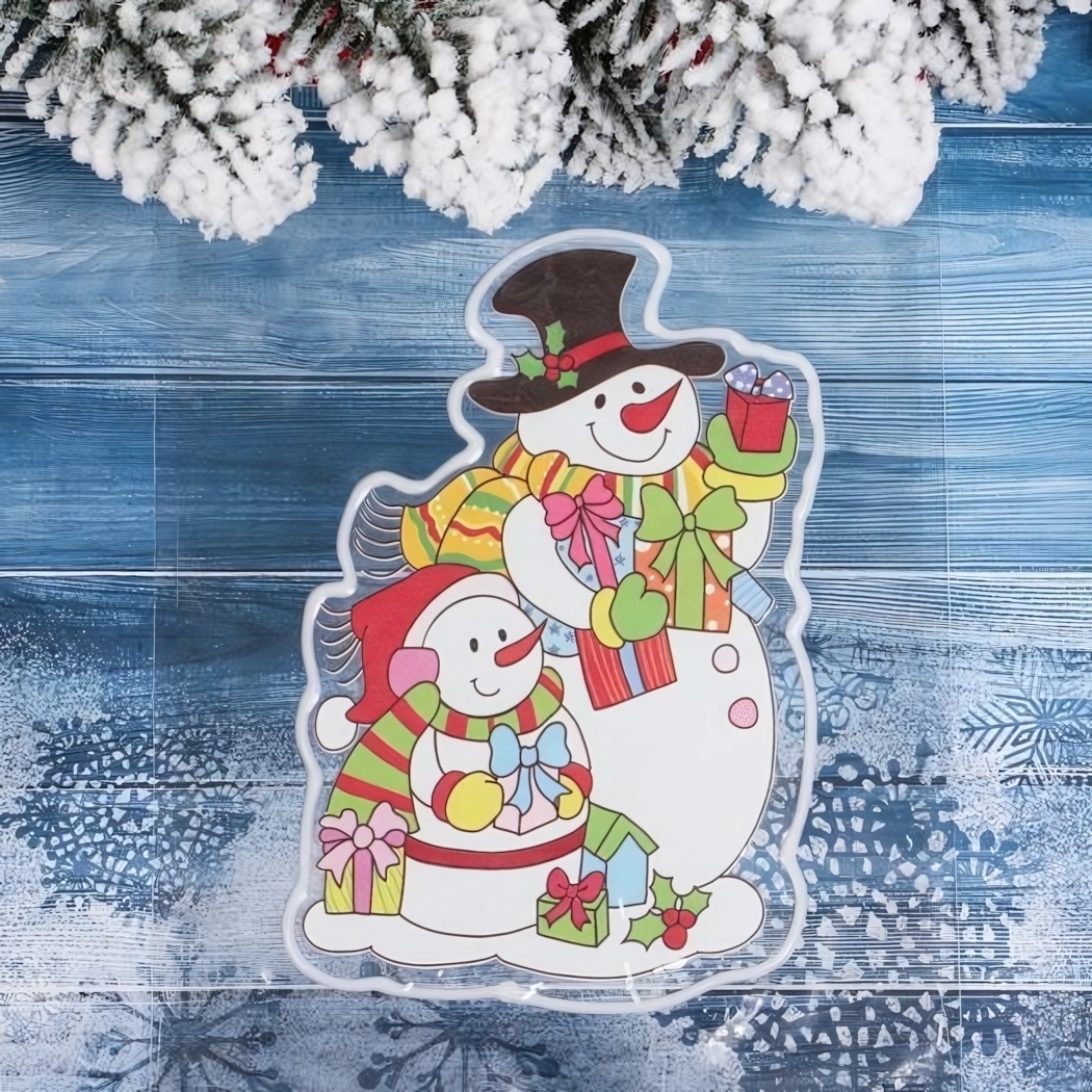 На наклейке изображены два снеговика: большой в черной шляпе с разноцветным шарфом и маленький в красной шапке с зелёно-красным шарфом. Они окружены подарками, снежными узорами и мягким зимним фоном. Благодаря качественной печати цвета остаются насыщенными даже при солнечном свете.