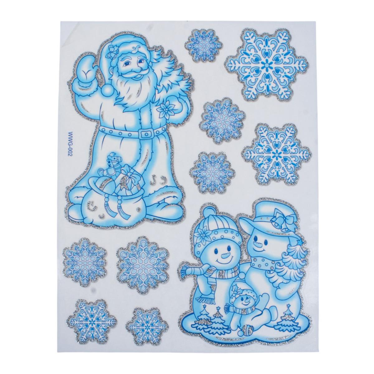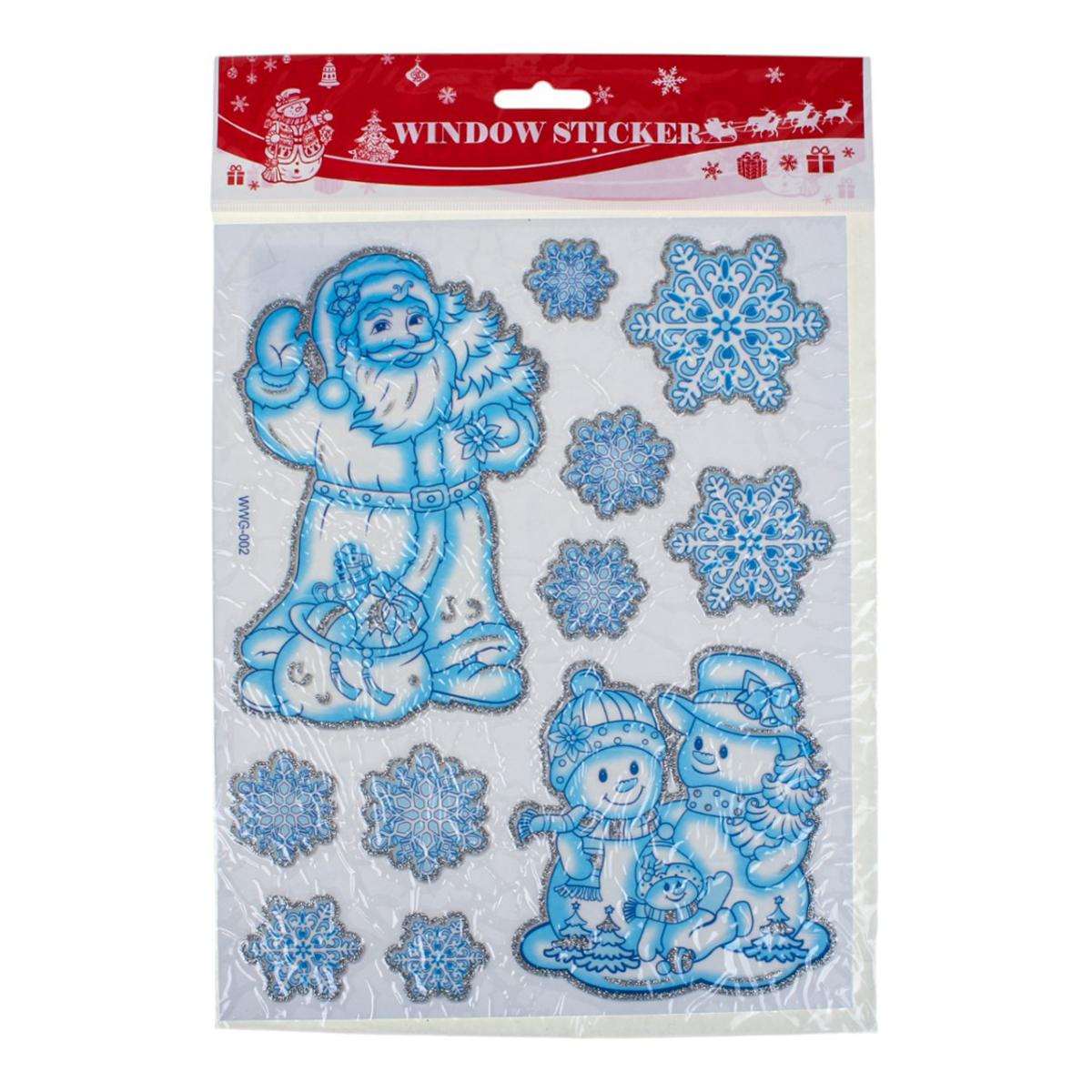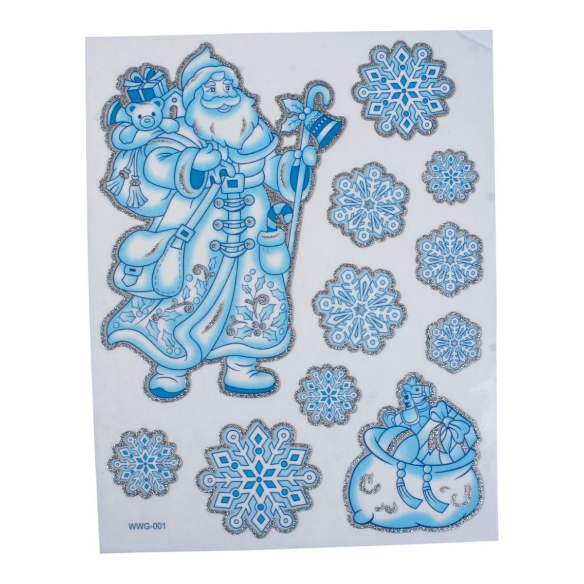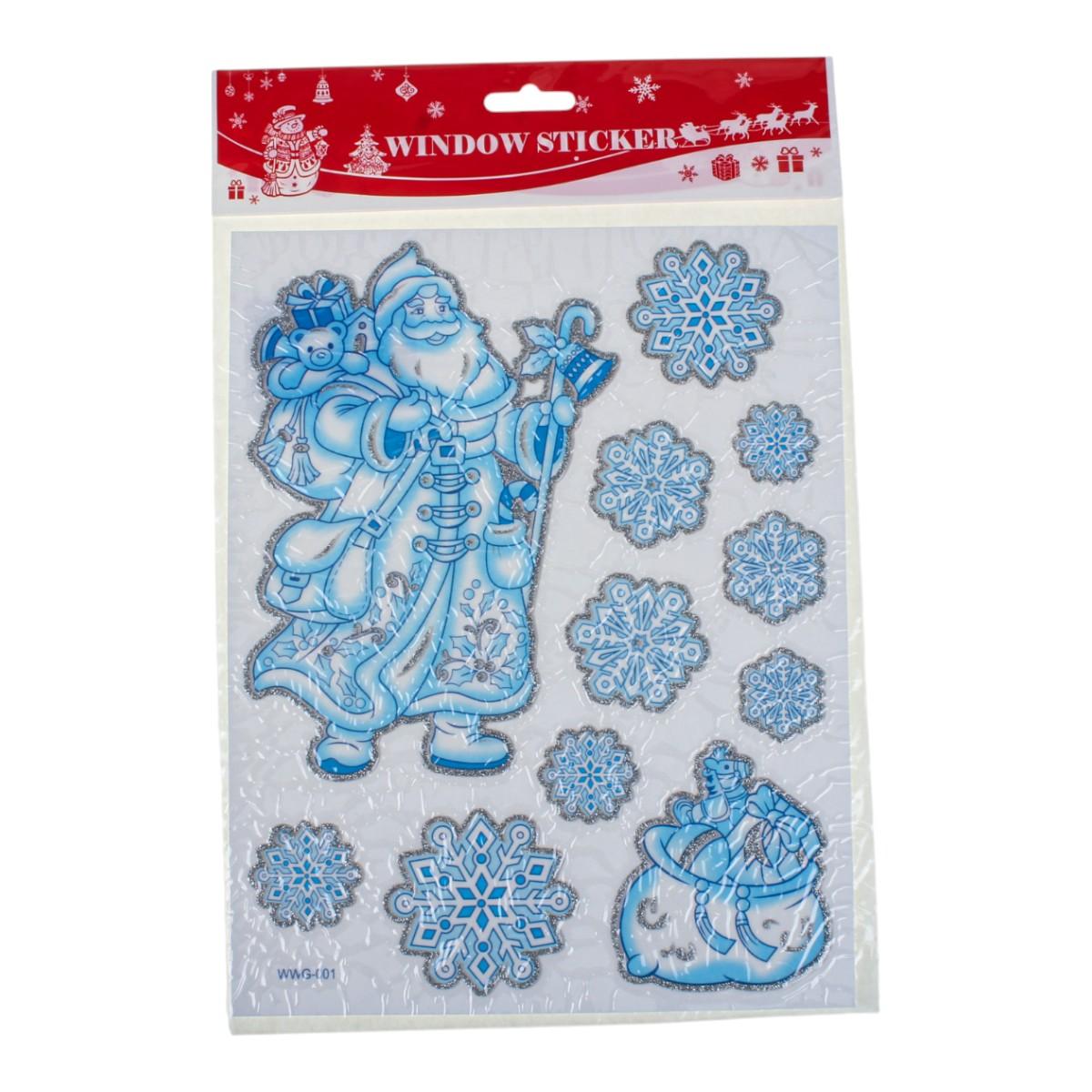 Наклейка новогодняя 20×30 см, микс, светло-голубой цвет, пакет, зимние рисунки: снеговик, снежинки, Дед Мороз