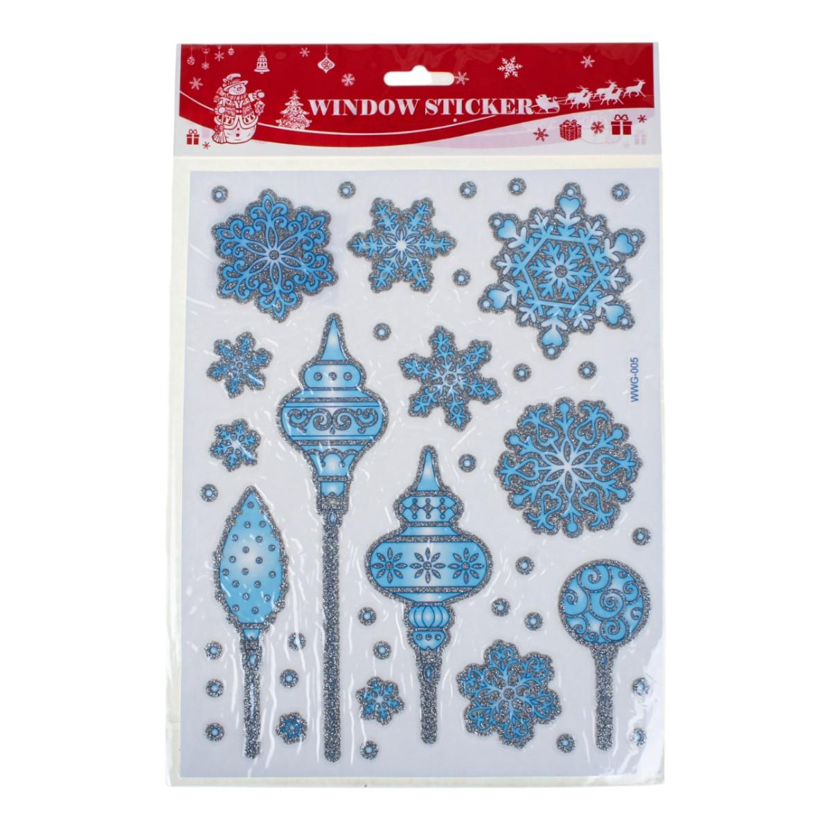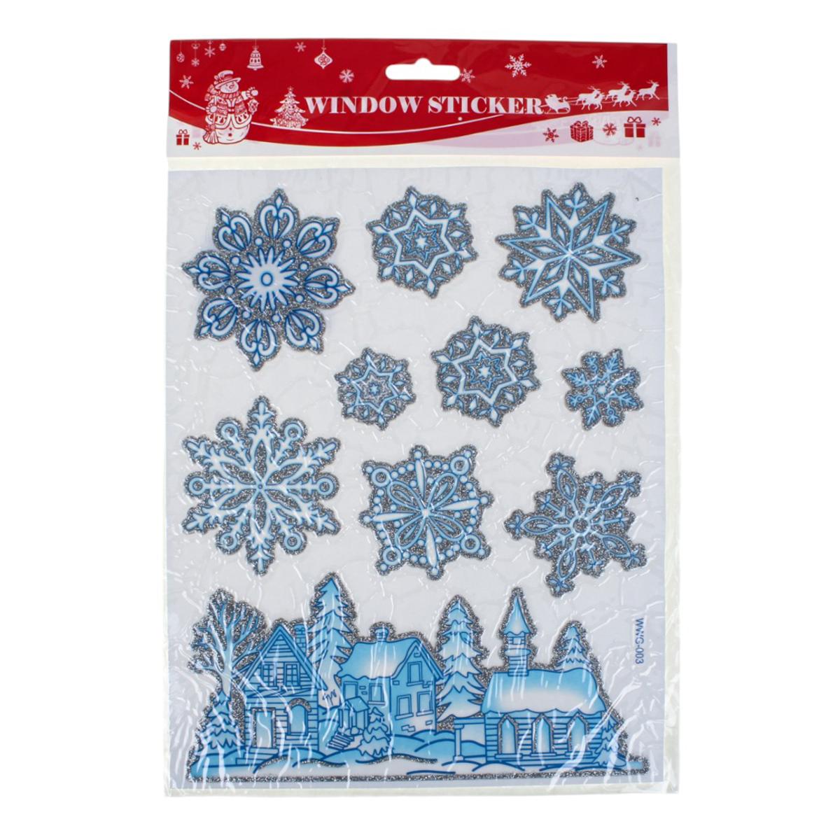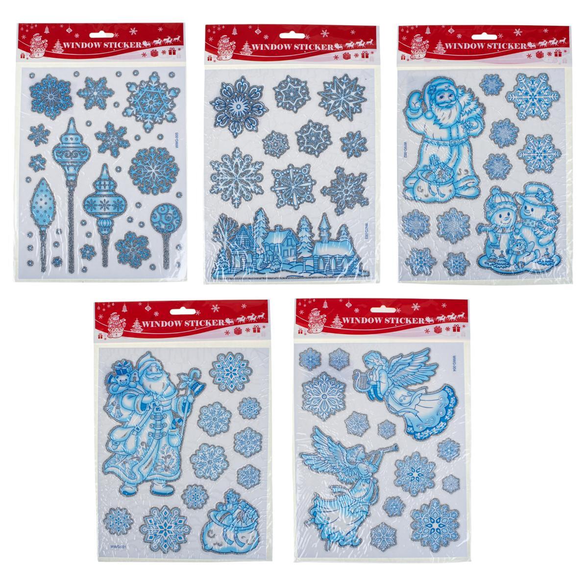 Наклейка новогодняя 20×30 см, микс, светло-голубой цвет, пакет, зимние рисунки: снеговик, снежинки, Дед Мороз