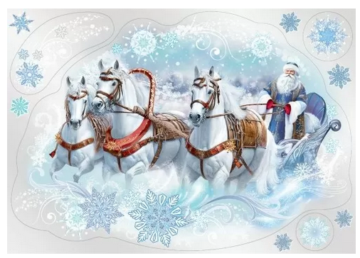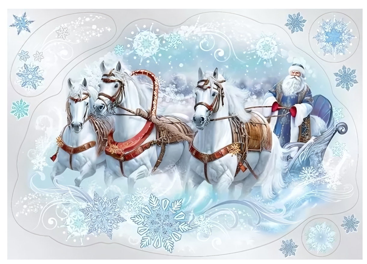 Создайте сказочное настроение с оформительской двусторонней наклейкой формата А3, изображающей Деда Мороза на тройке лошадей в заснеженном пейзаже. Яркий зимний сюжет с белыми лошадями, традиционными санями и бородатым сказочным персонажем моментально вызывает ощущение приближения Нового года.