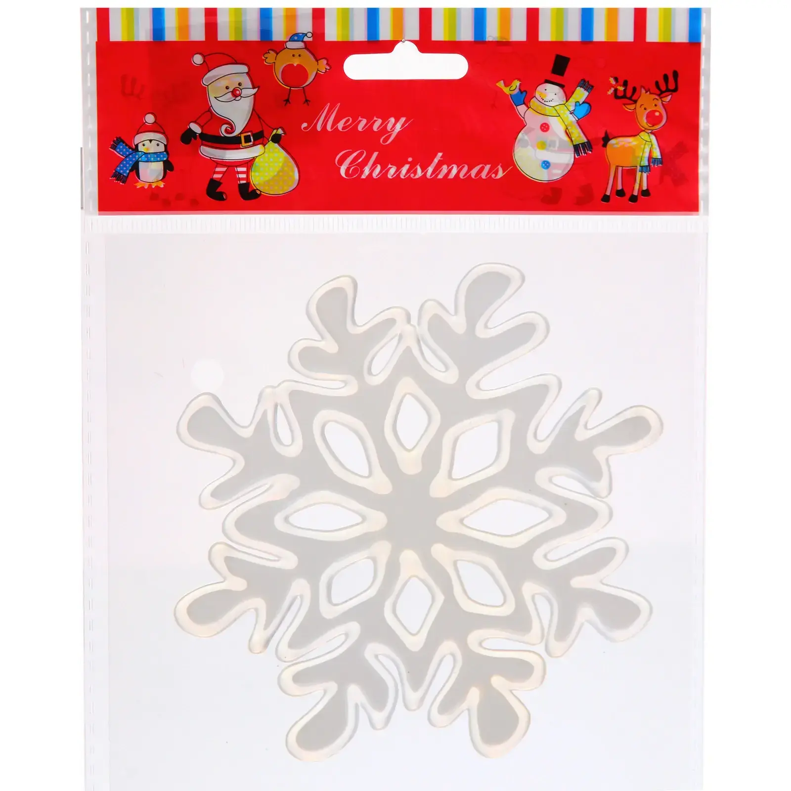 Наклейка поставляется в прозрачной плёнке с новогодним принтом — готовое решение для подарка. Яркий дизайн упаковки с изображением Санта-Клауса и снеговиков создаёт праздничное настроение ещё до вскрытия.