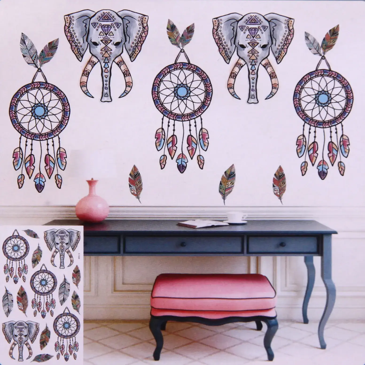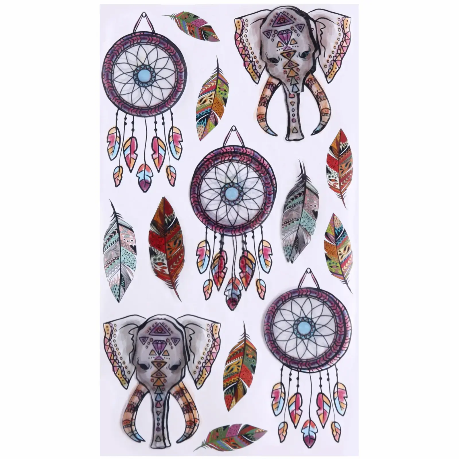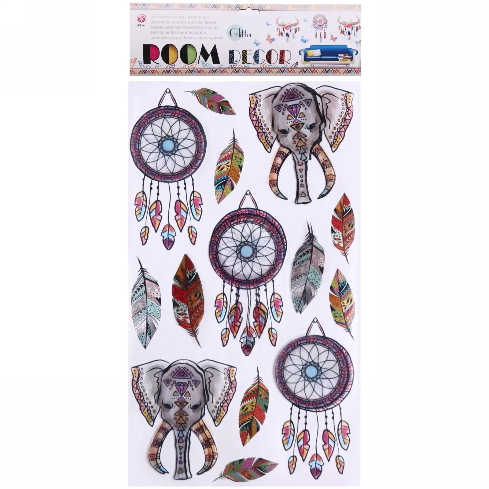 Изготовленные из качественной бумаги с ярким, насыщенным изображением, наклейки «Индия» подчеркивают вашу уникальность и желание украшать пространство. В ассортименте на рисунке представлены ловцы снов, стилизованные слоны и разноцветные перья, выполненные с детализацией и использованием блестящего эффекта, что добавляет декоративный блеск и объем.