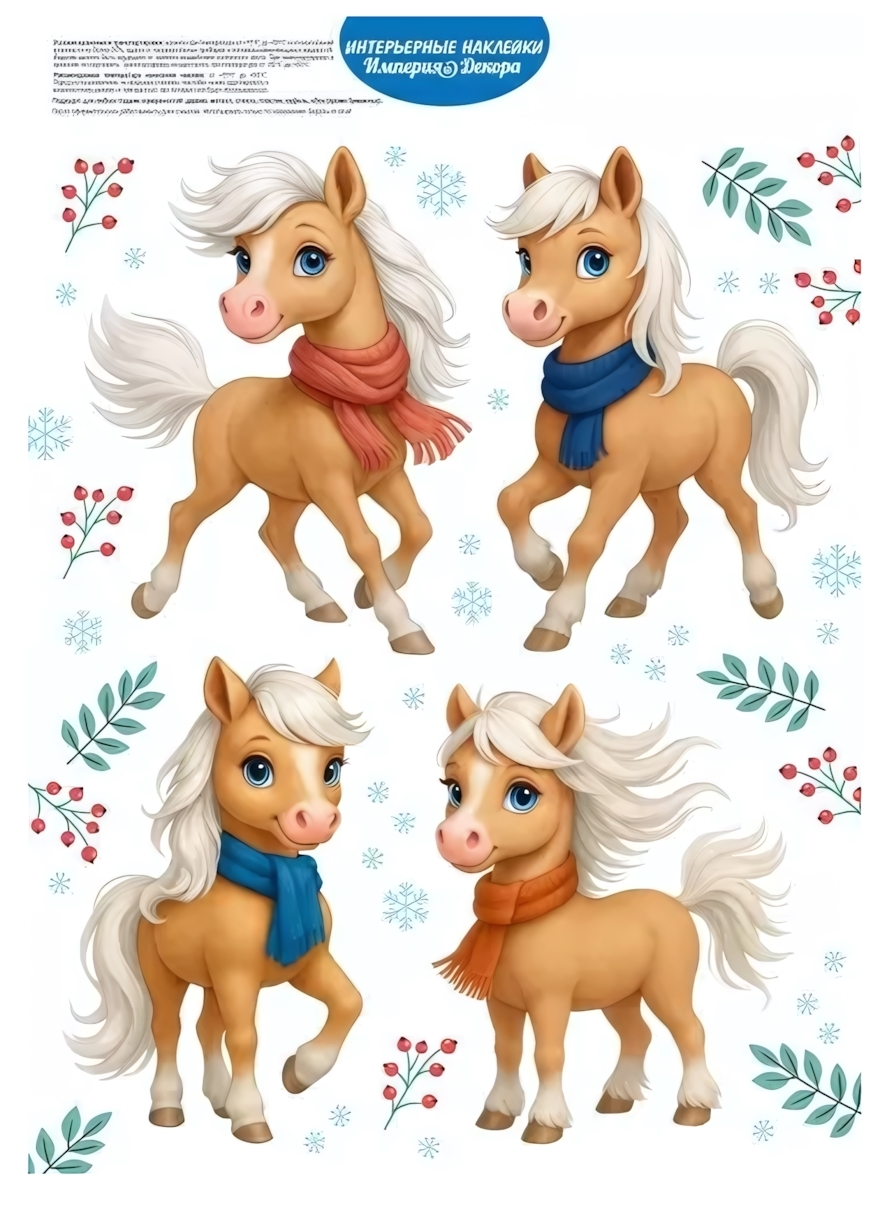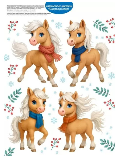 На листе изображены четыре пони в разных позах: от спокойной стойки до игривого наклона головы. Дополняют композицию листья и красные ягоды, создавая ощущение уюта и завершенности рисунка. Формат наклеек — А4 (примерный размер 332×237 мм), что позволяет использовать их как целиком, так и отдельными элементами. В упаковке — один лист с изображениями.
