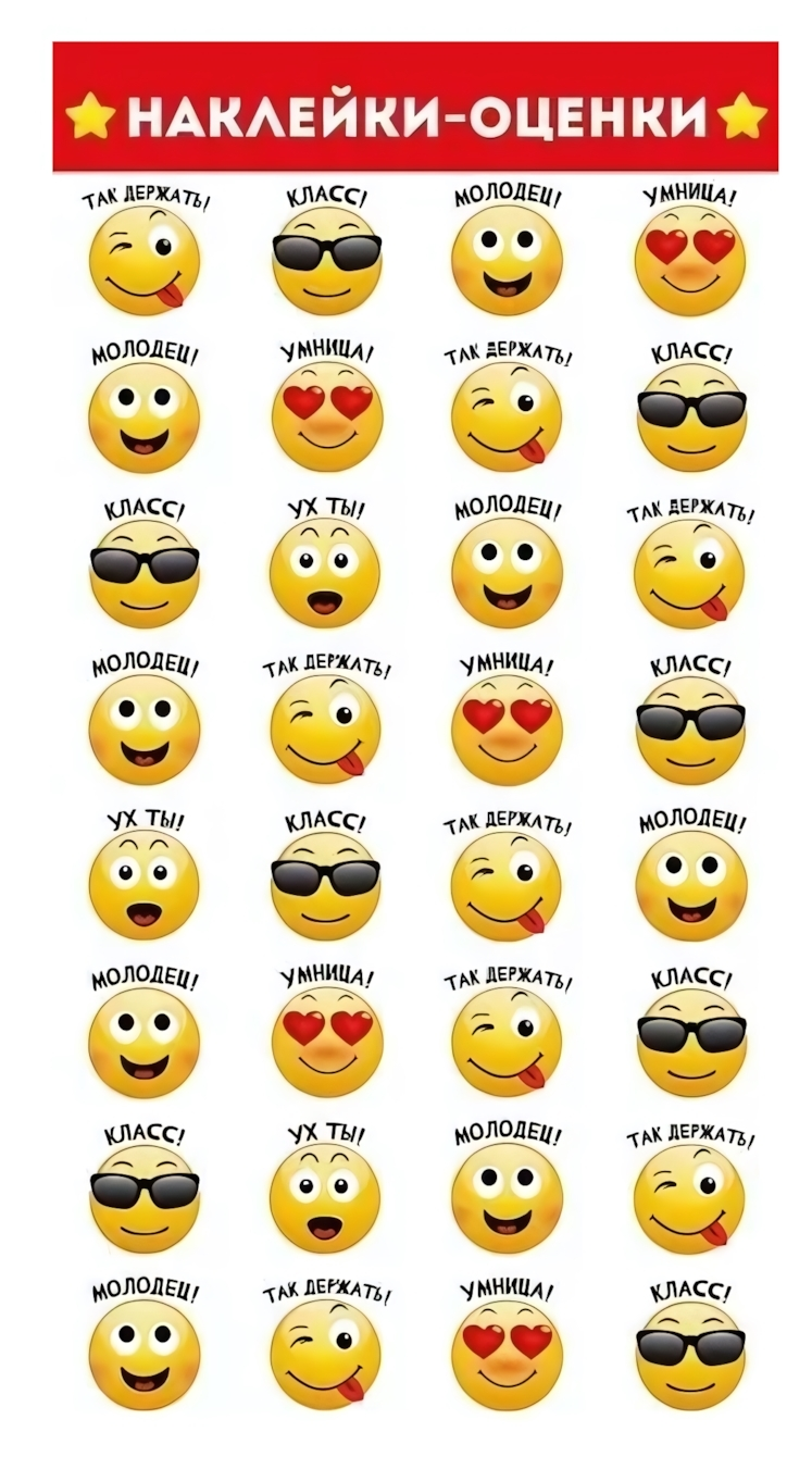 - Каждый лист содержит 32 круговые смайлики с надписями: «ТАК ДЕРЖАТЬ!», «КЛАСС!», «МОЛОДЕЦ!», «УМНИЦА!», «УХ ТЫ!»