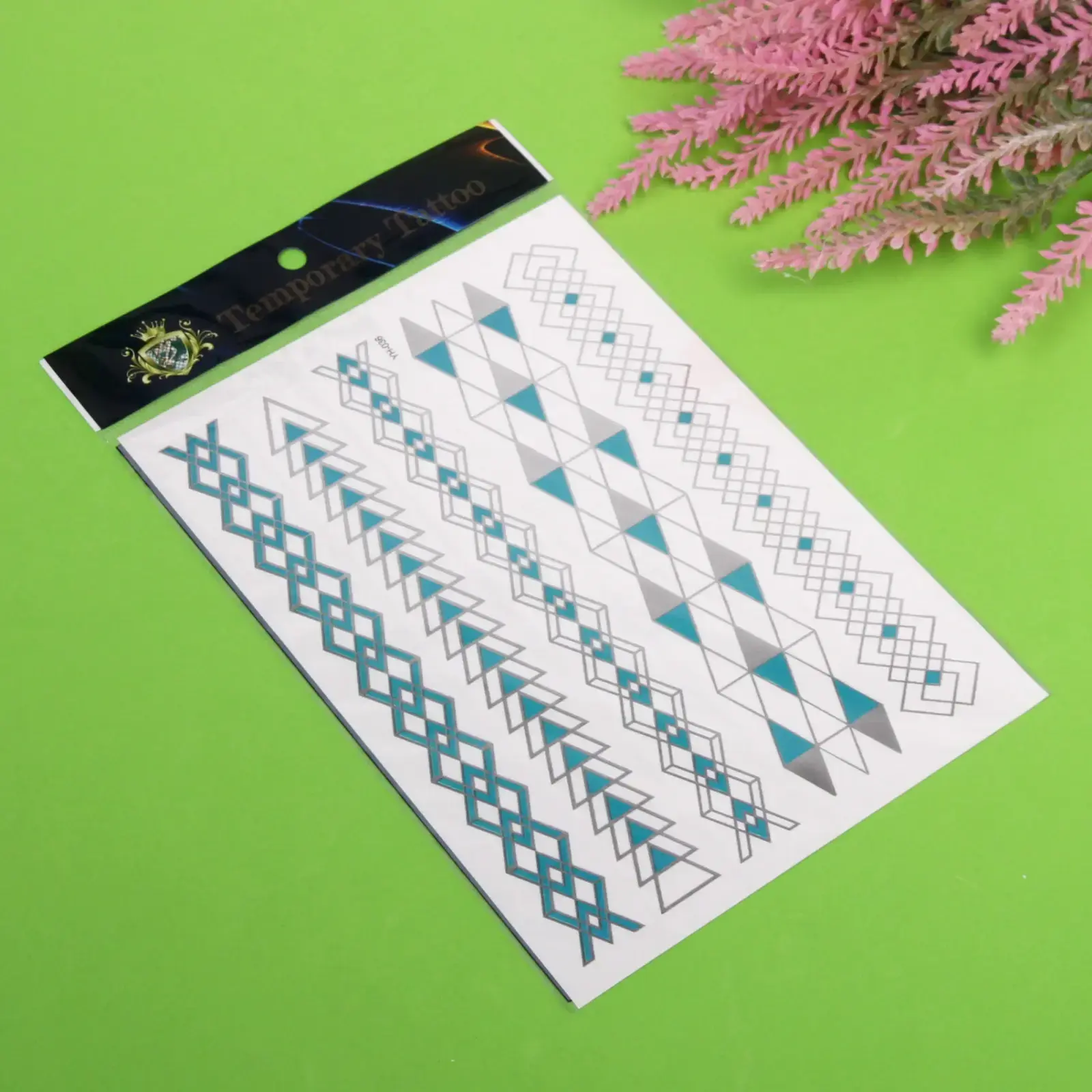 Эти наклейки выделяются среди других благодаря своим ярким геометрическим узорам, выполненным в бирюзовом, сером и белом цветах. Они не только красивы, но и долговечны, сохраняя свой вид на протяжении нескольких дней. Кроме того, их легко удалить, не оставляя следов на коже. Это идеальное решение для тех, кто хочет добавить немного креатива в свой стиль без необходимости делать постоянные татуировки.