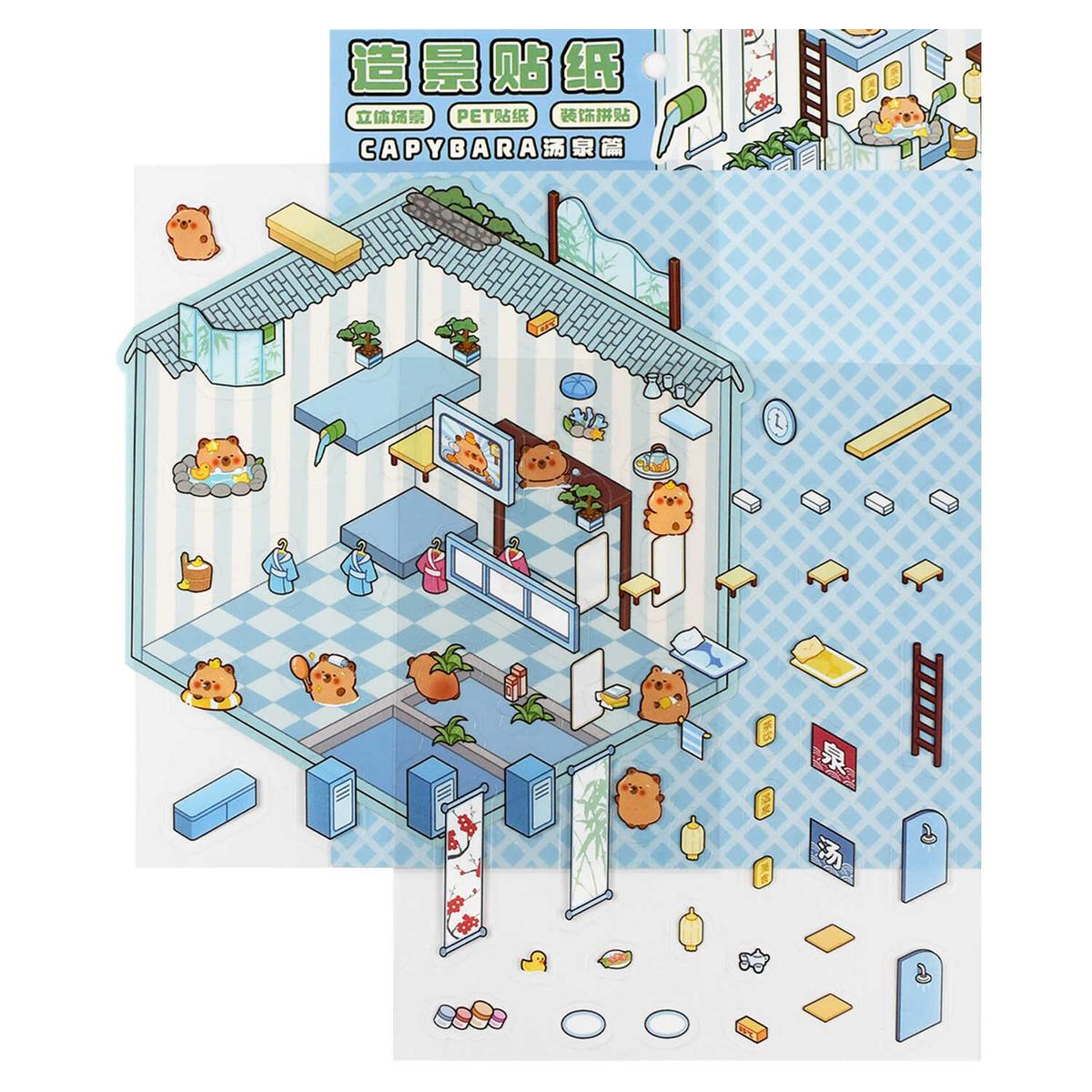 - Декоративные наклейки (2 листа): более 60 ярких элементов. Здесь вы найдете капибар в разных позах, ванночки, халаты, комнатные растения, фонарики и даже крошечных уточек.