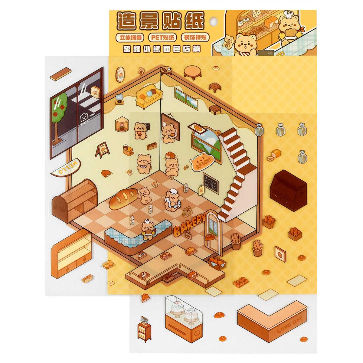В состав входят два листа с вырубными наклейками и одно плотное игровое поле для наклеивания с изображением интерьера. На элементах детально прорисованы очаровательные персонажи, стеллажи, кофейные принадлежности и вывески «BAKERY» и «Coffee». Благодаря качественному клеевому слою детали надежно фиксируются на поле, позволяя создать завершенную интерьерную композицию, которой захочется любоваться.