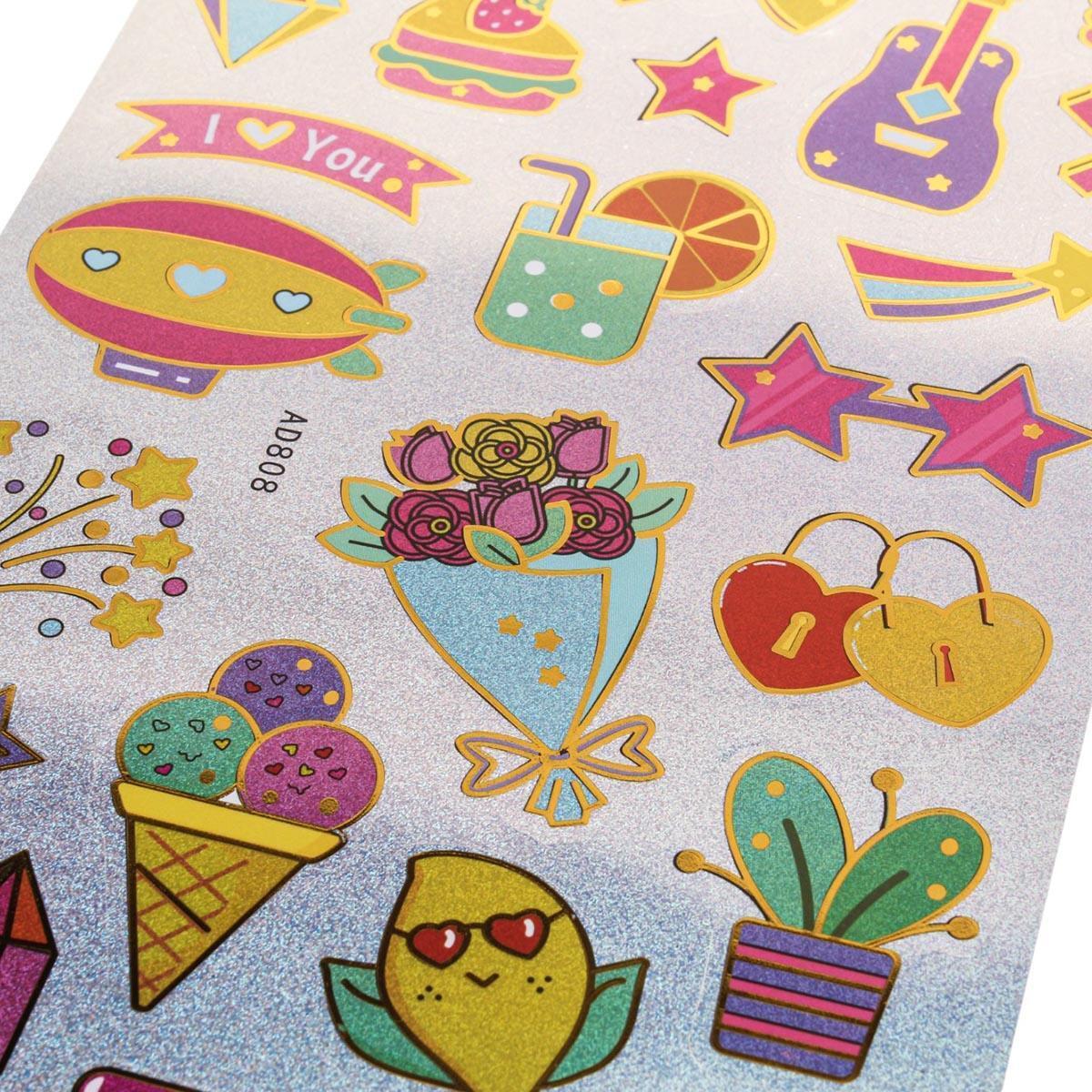 Размер упаковки составляет 30х15 см, что делает наклейки удобными для хранения и использования. В наборе представлены разнообразные дизайны, включая изображения фруктов, еды, животных и милых символов. Наклейки выполнены из качественного материала, что обеспечивает их долговечность и яркость цветов.
