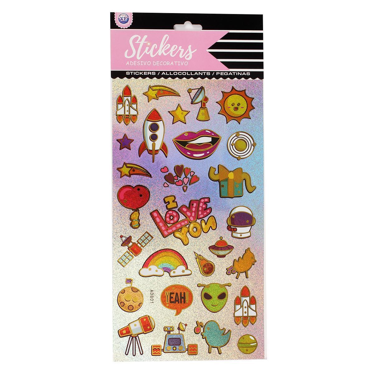 Удобный формат листа 30*15 см содержит множество наклеек разного размера и формы. Среди них вы найдете как крупные элементы (ракеты, киты), так и мелкие детали (звездочки, сердечки).