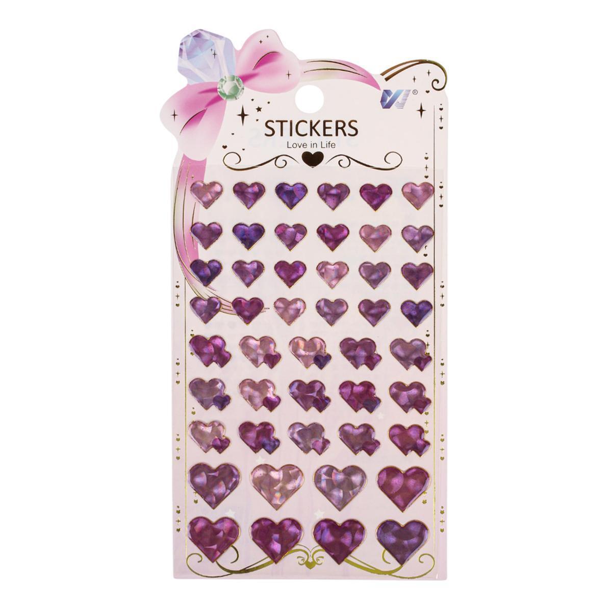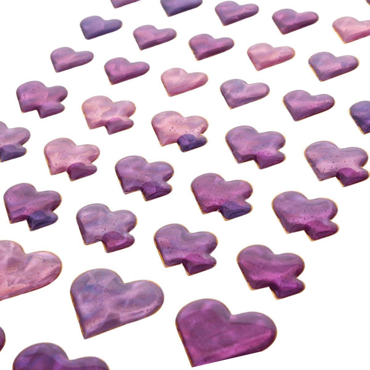 Каждый лист размером 20×11 см содержит 36 сердечек в трёх размерах (2.5, 1.8 и 1.2 см). Сиренево-розовая гамма с золотистым отливом сочетается с любыми пастельными оттенками. Основа из винила с защитным лаковым покрытием.