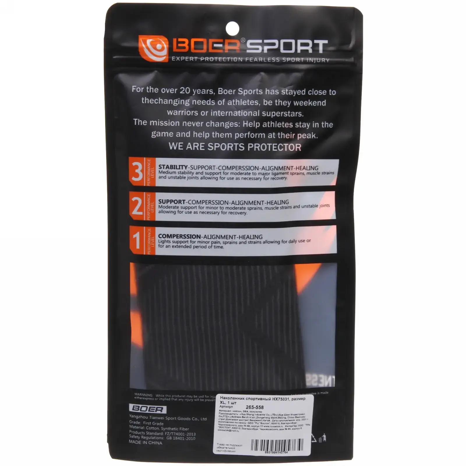 Особая вязка материала в зоне надколенника обеспечивает точечную компрессию, снижая нагрузку на связки. Удлинённая конструкция закрывает 15 см выше и ниже сустава для комплексной поддержки мышц.