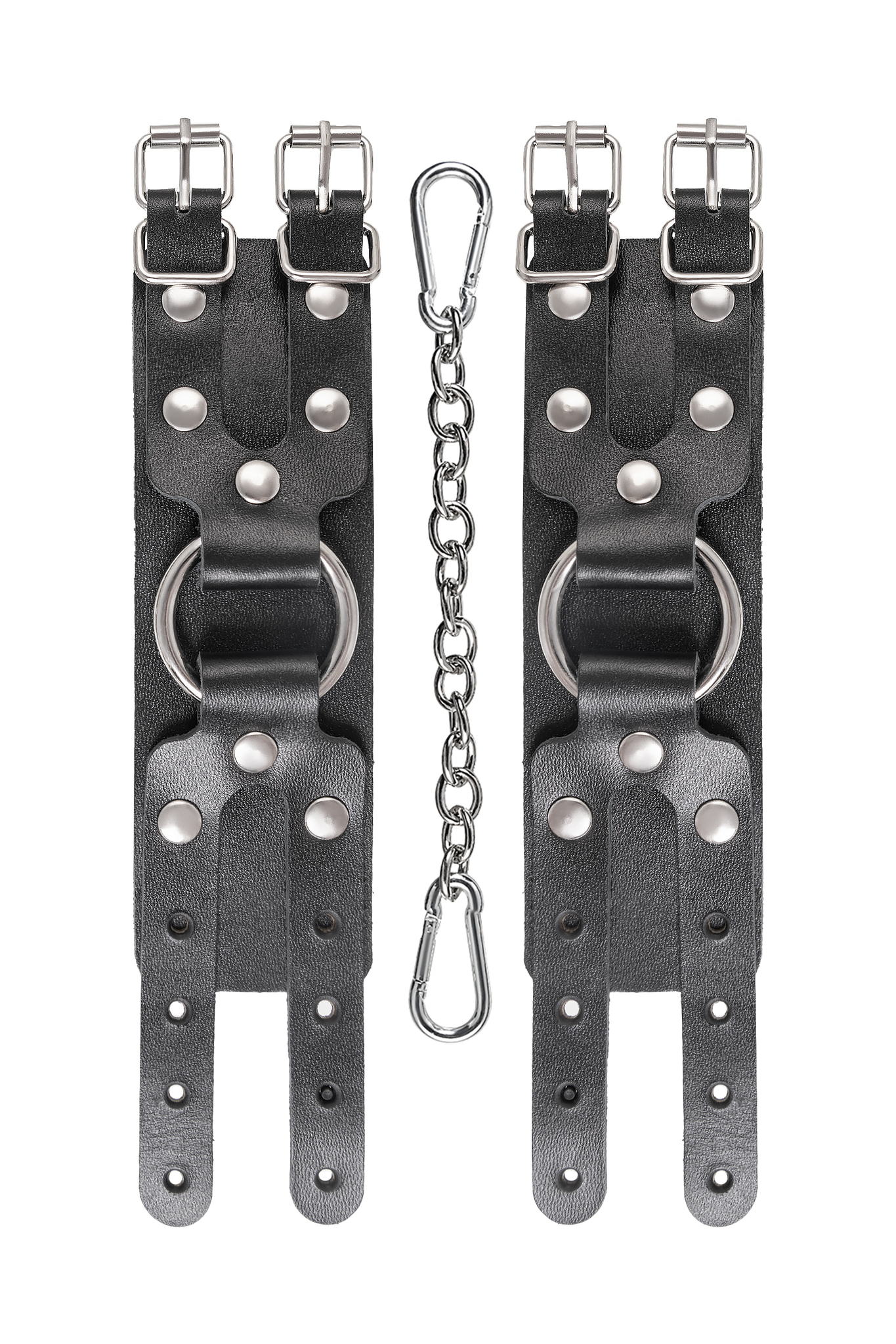 Наручники легко регулируются благодаря ремешкам с широким запасом регулировок, что позволяет подобрать идеальный обхват для любого запястья. Они соединены короткой съемной цепью с двумя карабинами, которую можно заменить на другой аксессуар по вашему желанию. Эти наручники не только подходят для БДСМ-сессий, но и могут быть использованы как стильный браслет в повседневной жизни.