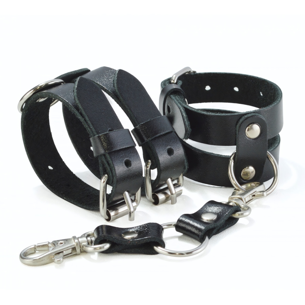Модель состоит из двух кожаных манжет, соединенных между собой короткой перемычкой с карабинами. Благодаря металлическим пряжкам размер легко регулируется, что делает аксессуар подходящим для разного обхвата запястий. Универсальный размер и простая фиксация позволяют быстро подготовиться к игре и так же легко снять аксессуар при необходимости.