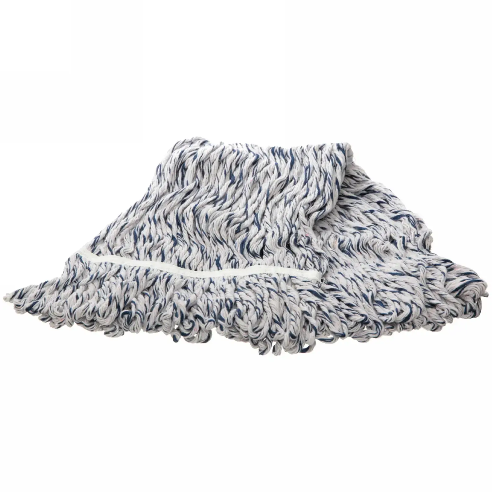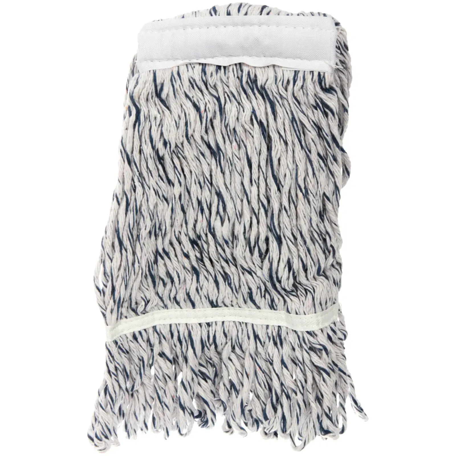 Насадка имеет прямоугольную форму с бахромой по краям, что способствует лучшему захвату грязи. Основной цвет насадки — белый с синими и серыми полосами, что придаёт ей стильный вид. Размеры насадки не указаны, но она достаточно объемная и подходит для стандартных швабр. Используйте эту насадку для достижения идеальной чистоты в вашем доме!
