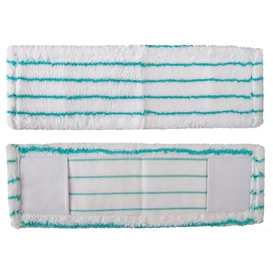 Прямоугольная форма со скошенными углами оптимальна для большинства типов швабр. Ворсистая поверхность с ячеистой структурой задерживает пыль и мелкий мусор, а гладкая белая вставка обеспечивает дополнительное трение для сложных загрязнений. Полосы из небесно-голубой микрофибры не только декоративны, но и служат индикатором износа — при потере цвета насадку рекомендуется заменить.