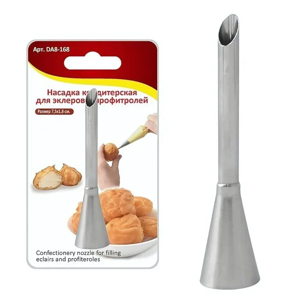 Насадка предназначена для использования с кондитерскими мешками. Просто выберите подходящий мешок, отрежьте кончик, вставьте насадку и заполните мешок кремом или другой начинкой. Затем аккуратно наполняйте эклеры и профитроли, наслаждаясь процессом и результатом. Она идеально подходит как для профессиональных кондитеров, так и для домашних кулинаров, желающих порадовать своих близких вкусной выпечкой.