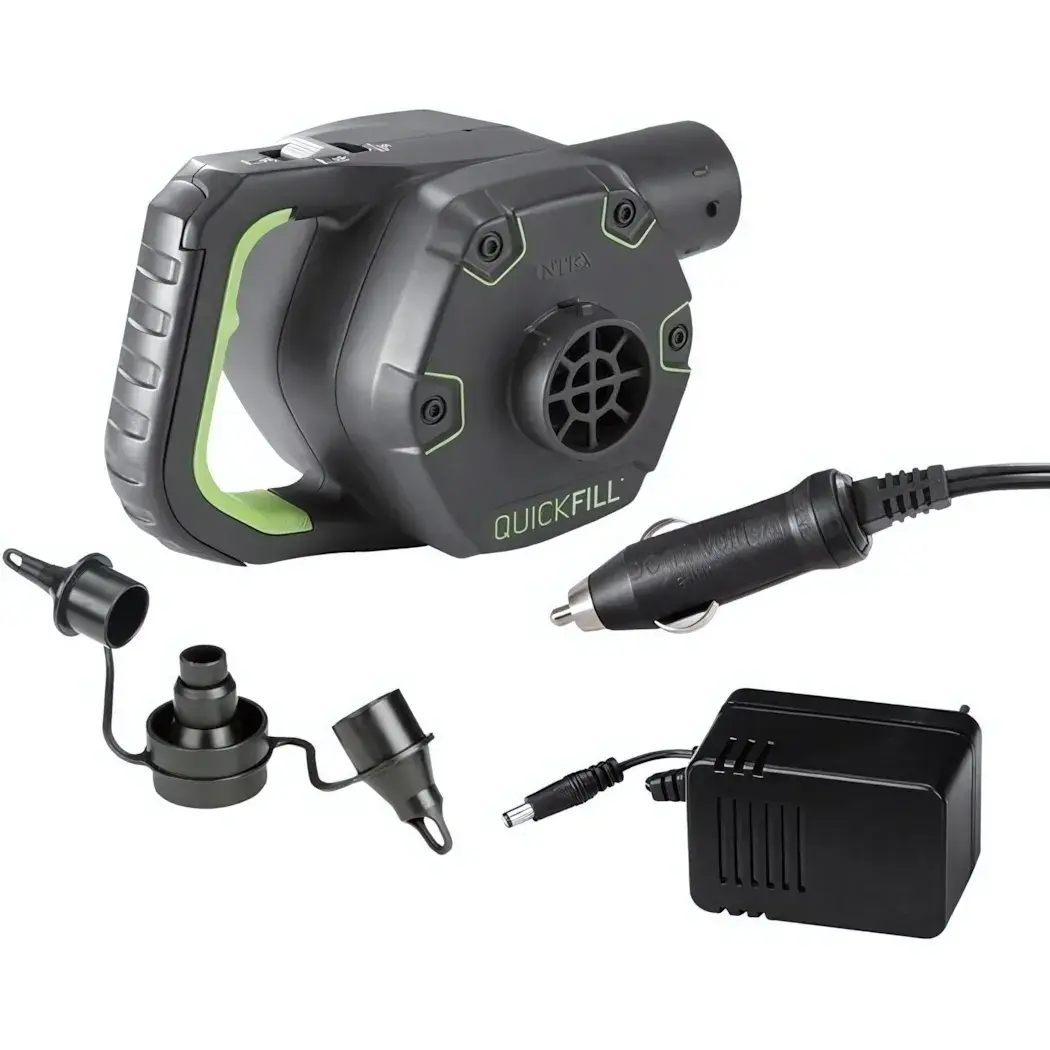 Насос Quick-Fill выполнен в универсальном черном цвете с зелеными акцентами. В комплект входят два адаптера: один с круглым профилем, другой — в форме воронки, что позволяет надувать изделия различной формы и размера. Вентиляционное отверстие на корпусе обеспечивает эффективное охлаждение во время работы. Этот насос идеально подходит для продукции Intex и Bestway, что делает его универсальным инструментом для всех любителей активного отдыха.