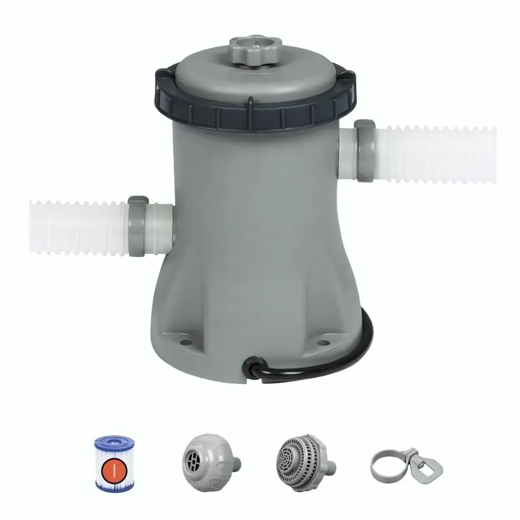Насос подходит для каркасных и надувных бассейнов диаметром от 305 до 366 см. Его принцип работы прост: вода прокачивается через шланг, проходит фильтрацию через специальный фильтр-картридж и возвращается обратно в бассейн уже очищенной. Замена фильтров осуществляется легко и быстро, что позволяет поддерживать чистоту воды без лишних усилий.