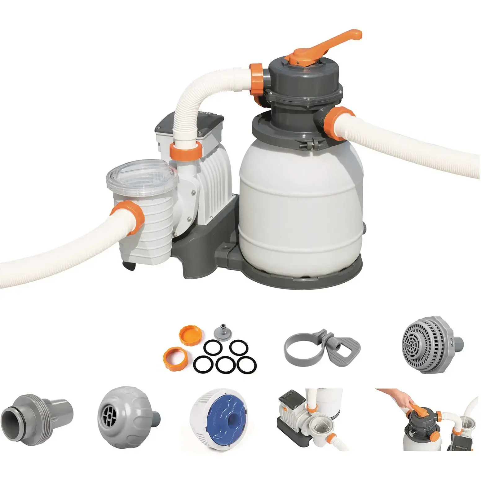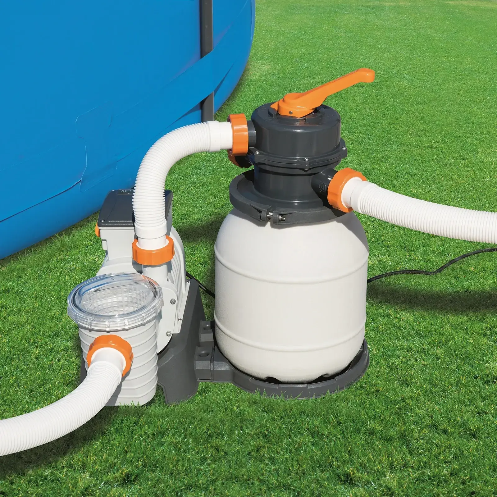 Насос-фильтр выполнен из прочного пластика, что обеспечивает его долговечность и устойчивость к внешним воздействиям. Комплектация включает в себя сам фильтрующий насос, а также три гофрированных шланга для подключения. Убедитесь, что у вас есть необходимый фильтрующий песок, чтобы начать использовать насос сразу после установки.
