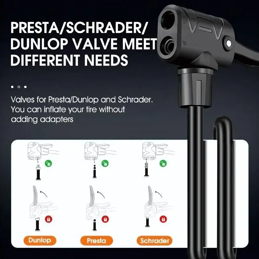 - Универсальную насадку, совместимую с клапанами Presta, Dunlop и Schrader;