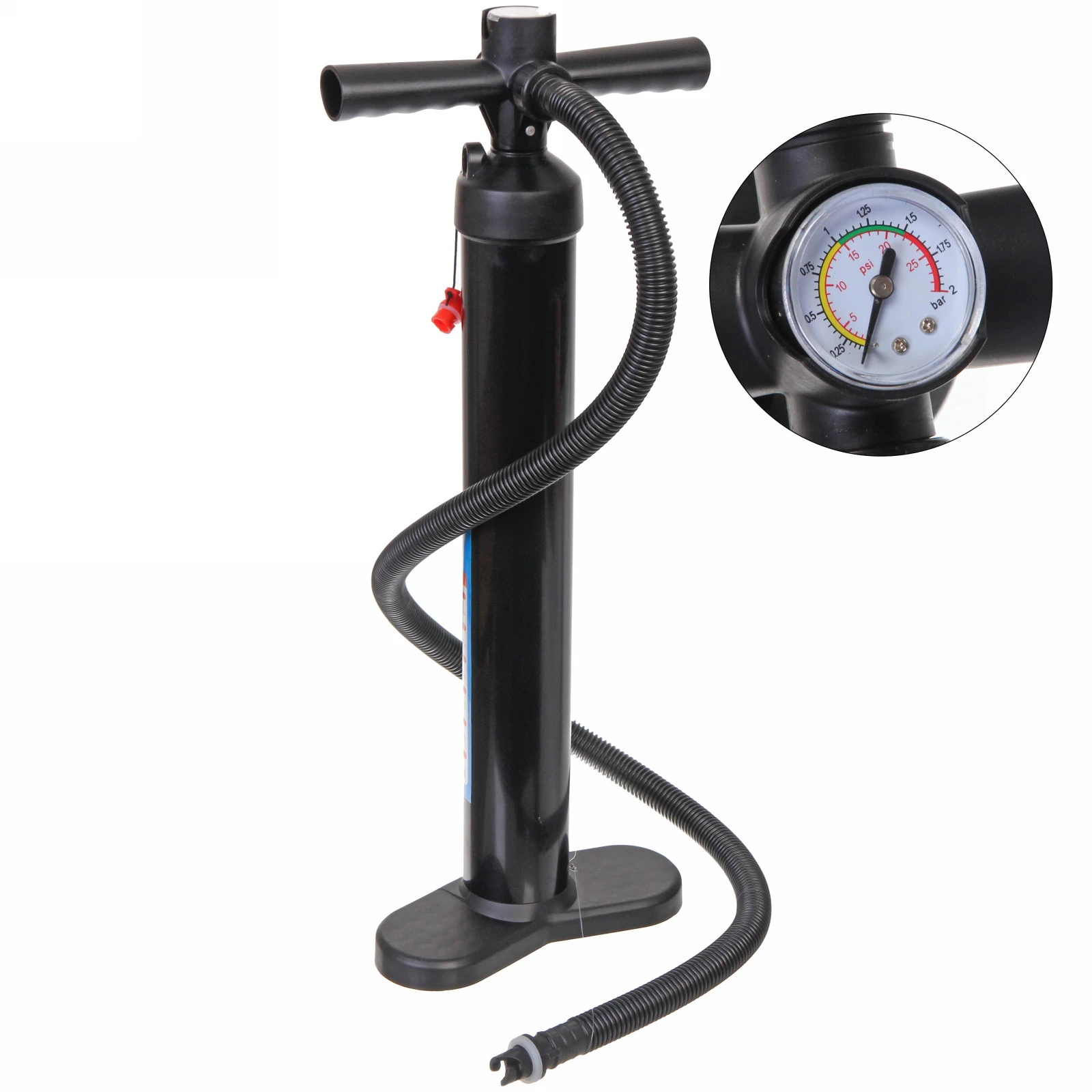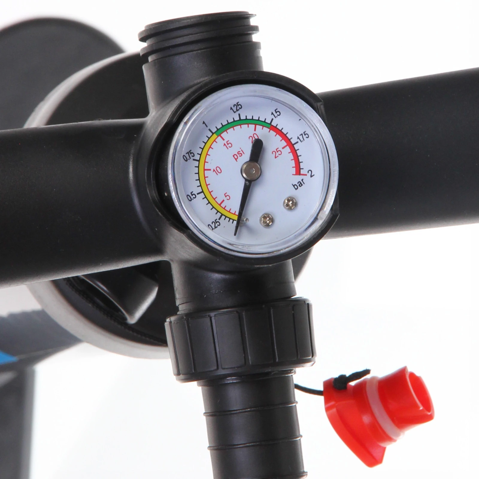 - Встроенный манометр с двойной шкалой — главное преимущество этого насоса. Вы всегда можете контролировать давление в реальном времени. Шкала измеряет как в PSI (от 0 до 25), так и в BAR (от 0 до 2), что удобно для точной настройки согласно рекомендациям производителя вашей доски. Цветные сектора (зеленый, желтый, красный) визуально указывают на оптимальный и предельный уровни давления.