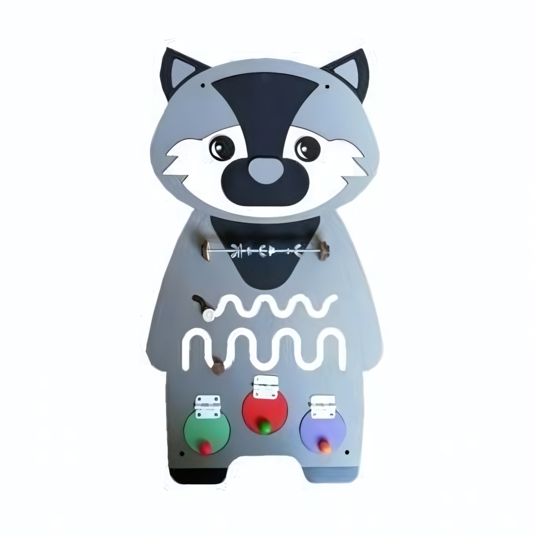 Настенный бизиборд 'Енотик' - это не просто игрушка, а настоящий тренажёр для развития ребёнка. Стильный дизайн в серо-голубых тонах органично впишется в интерьер детской комнаты.