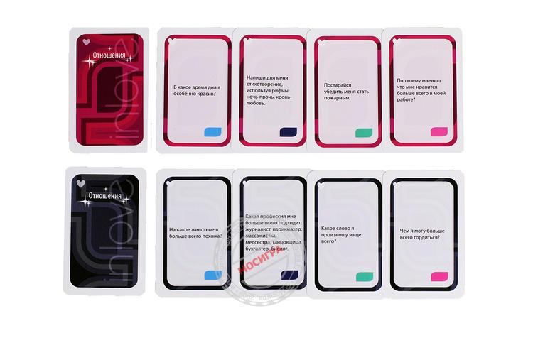 - Две колоды карт с заданиями: тёмно-синие для него и розовые для неё